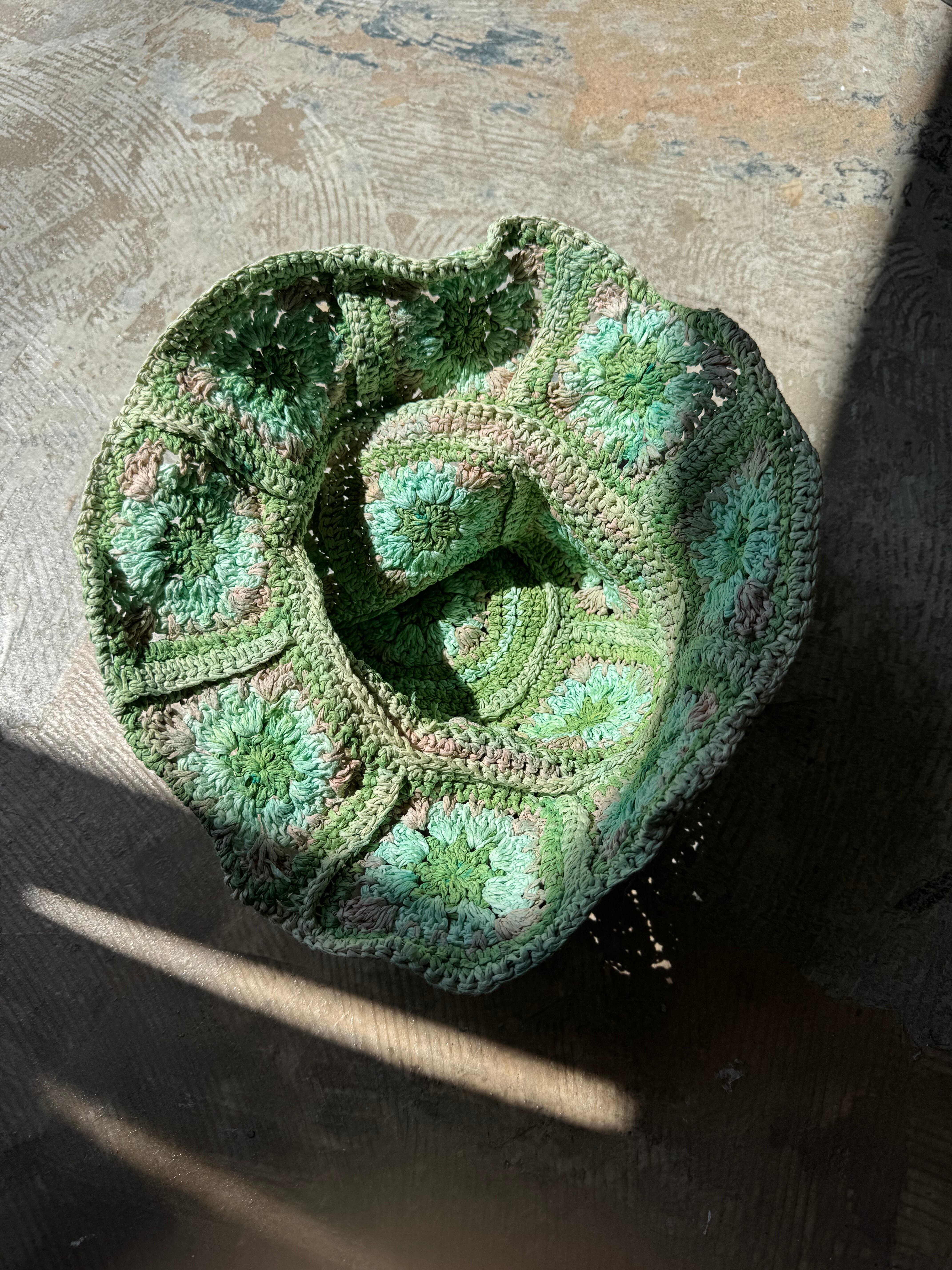 グリーンベースのカラーリング、雰囲気あるヒッピー柄、今から春、夏、秋に被り易い生地感。