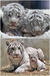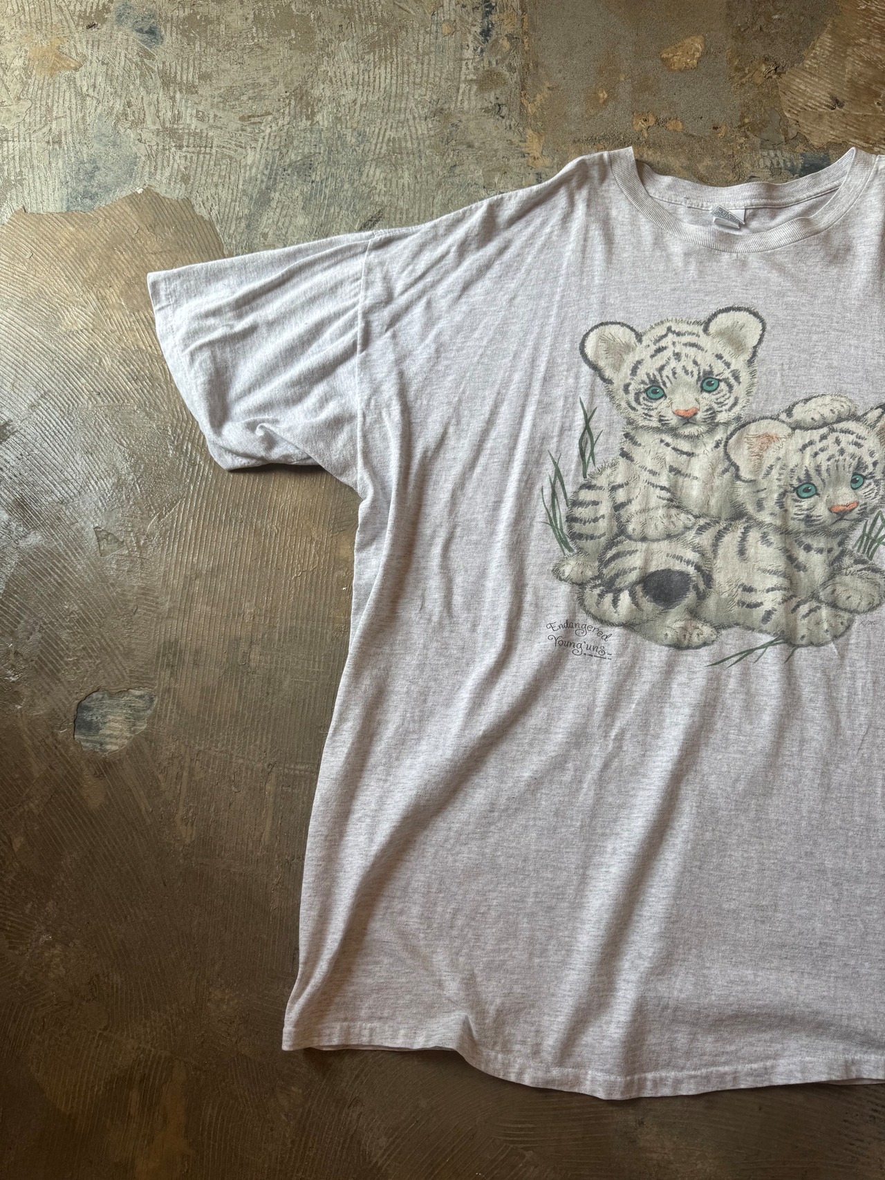 霜降りグレーボディに2頭の可愛らしいホワイトタイガーの赤ちゃんがプリントされた個性的な動物Tシャツ。