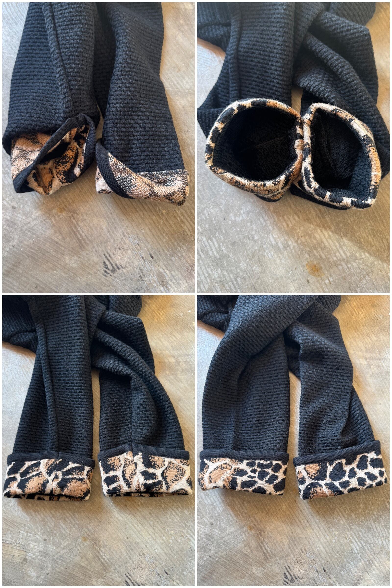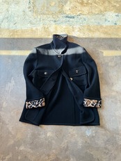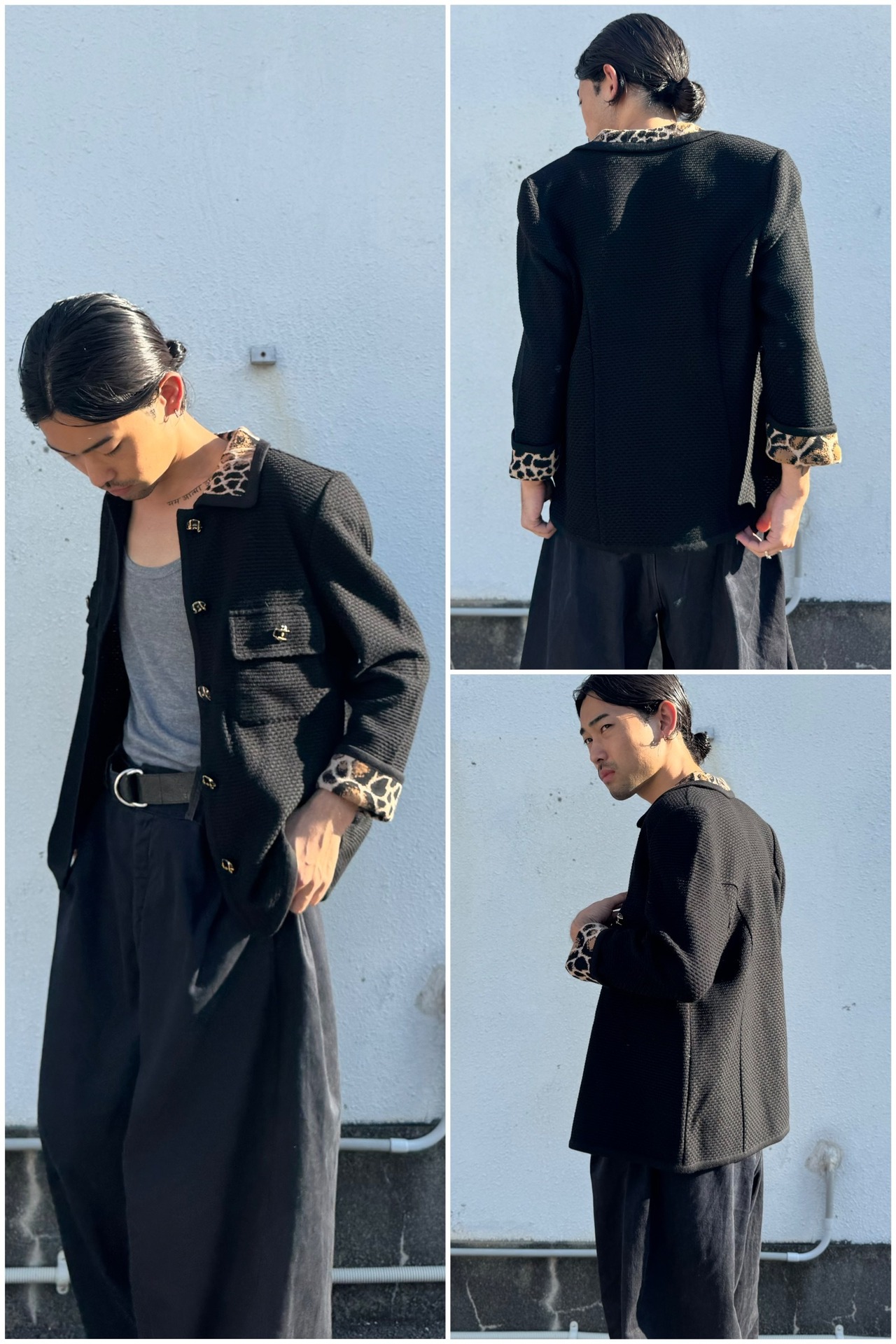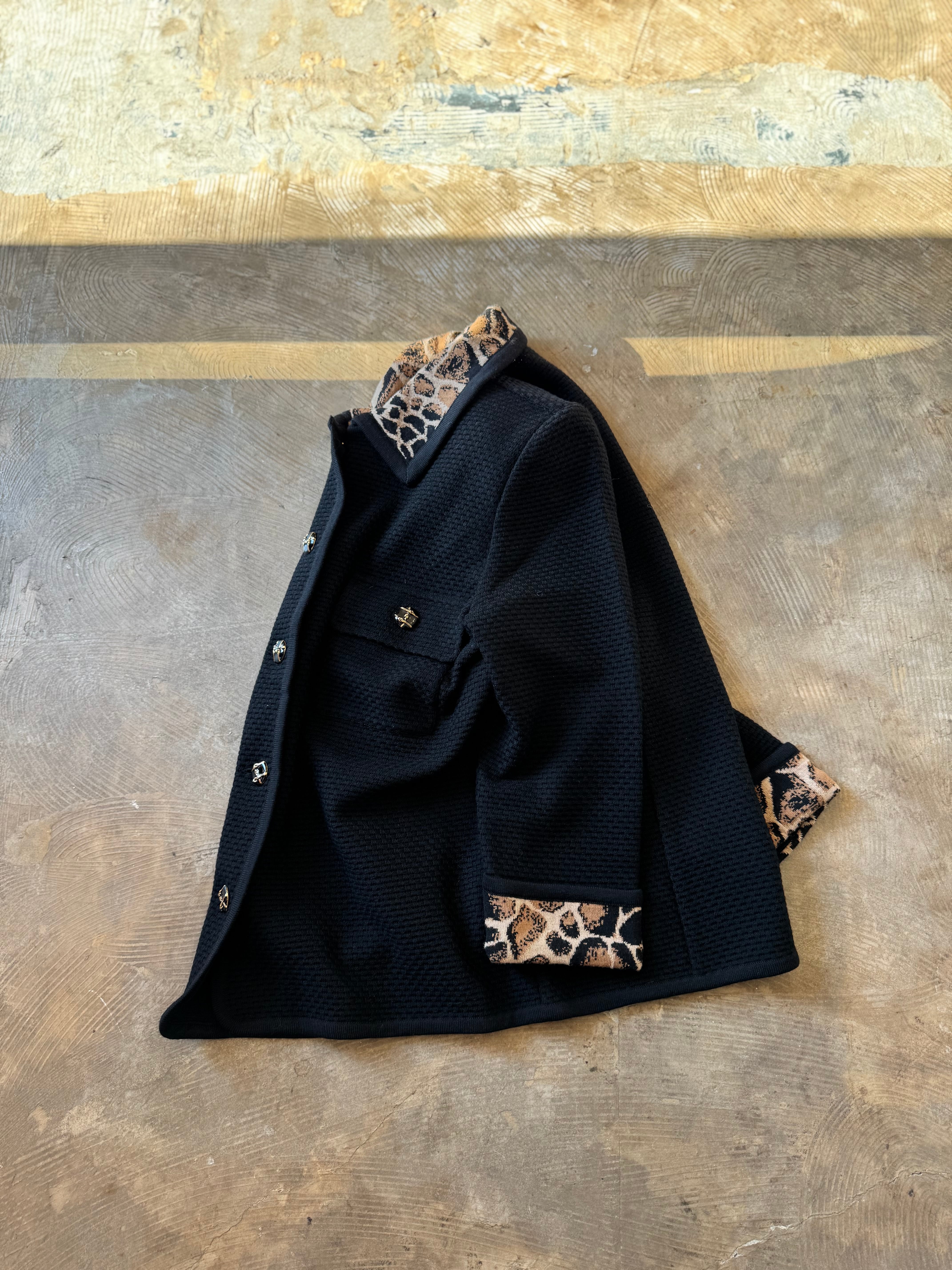 襟と袖先のレオパードデザインとブラックカラーのニット素材の組み合わせがインパクトあります‼︎
