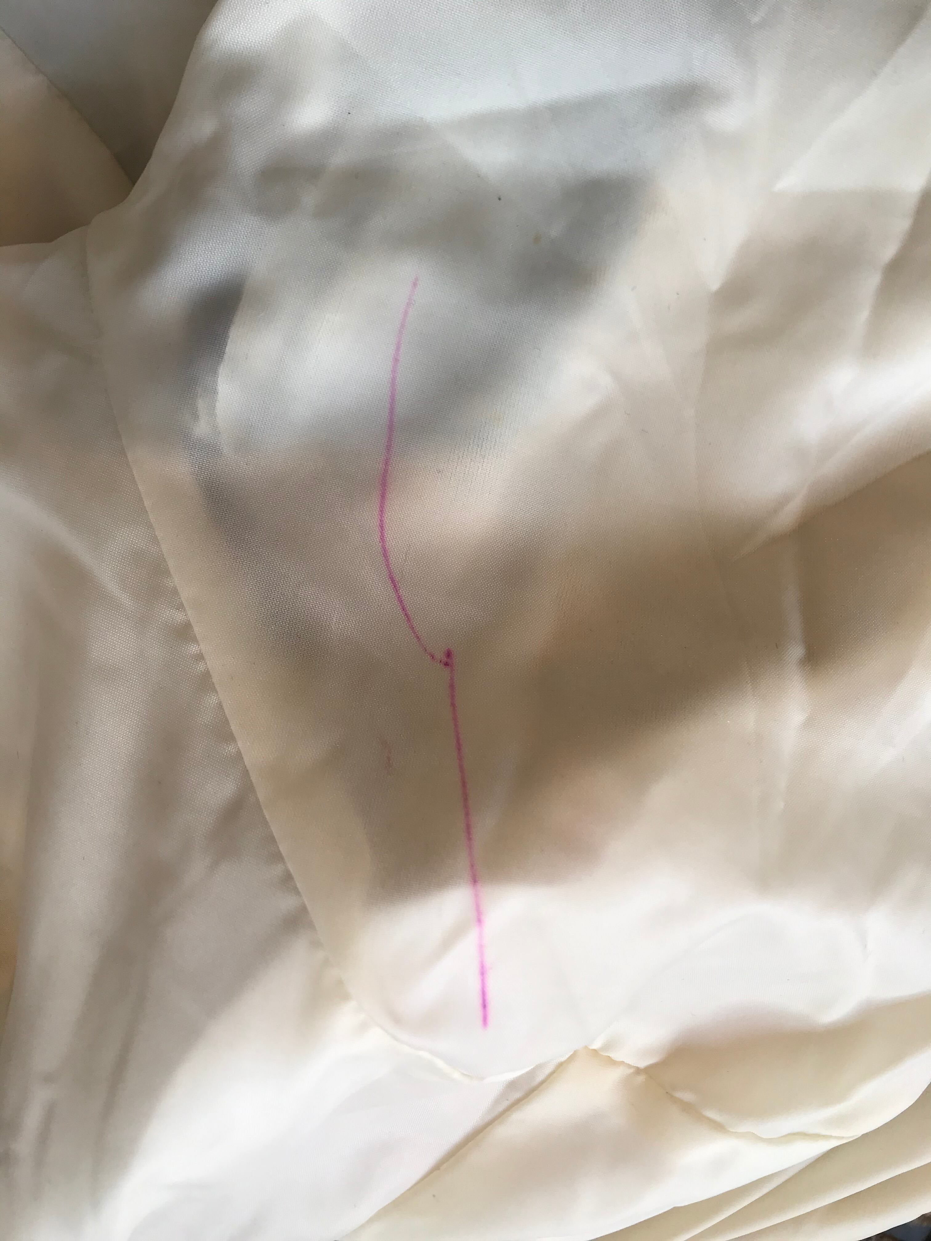 ユーズドで左腕と左肩の裏地に紫のペンの汚れがありますが特に気になるダメージや汚れはありません。