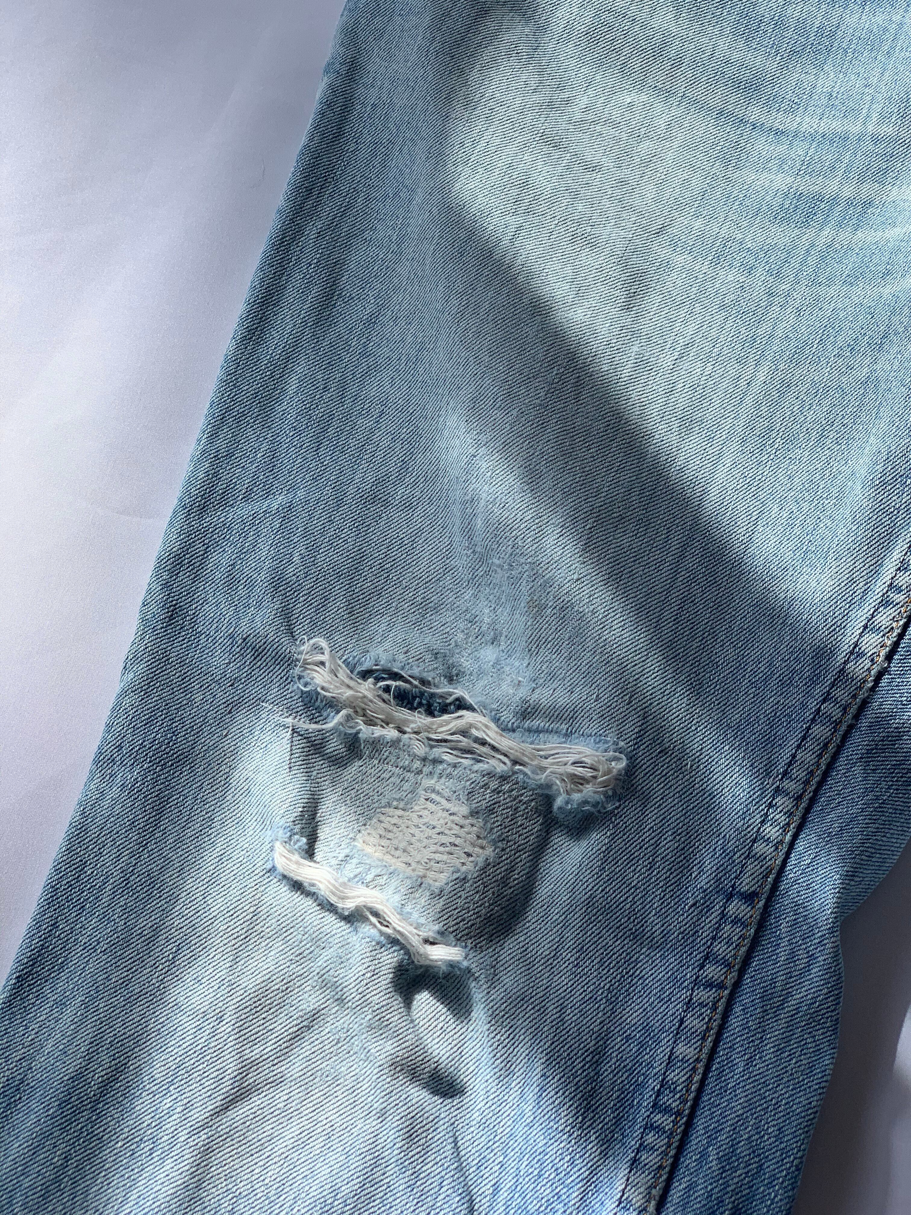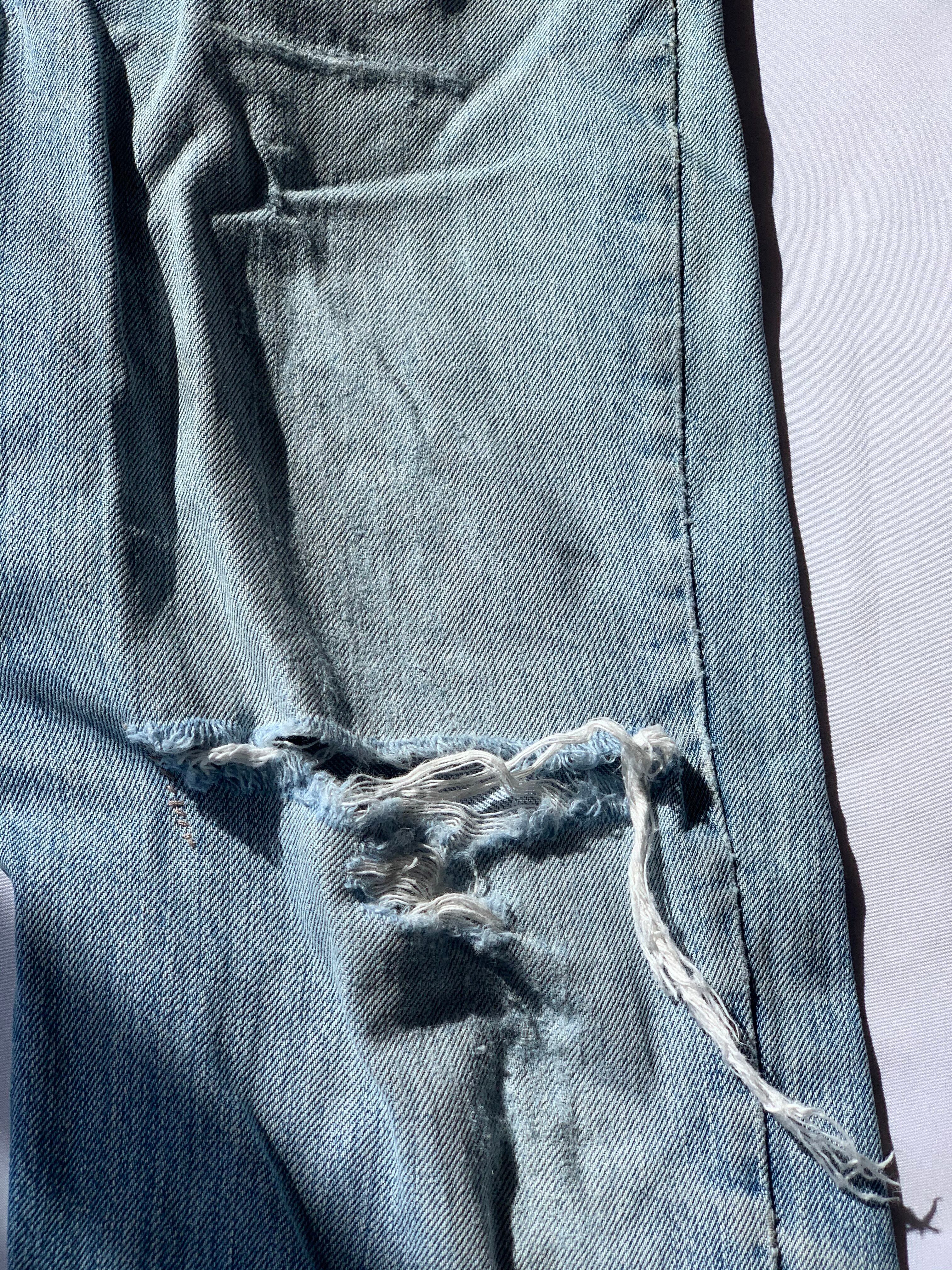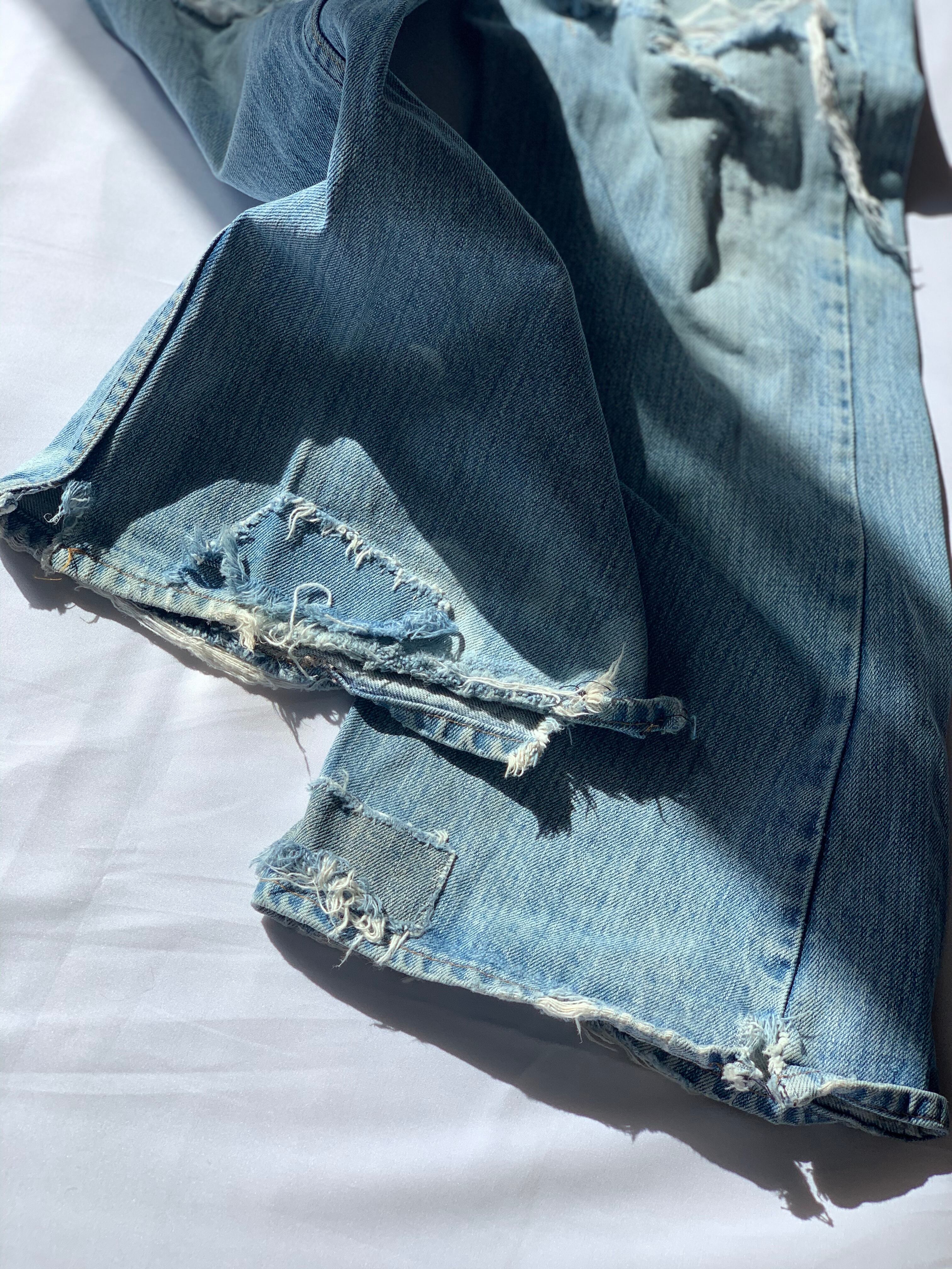 履き込まれたデニムの雰囲気、色落ち、リペア、ダメージが素晴らしい1本。