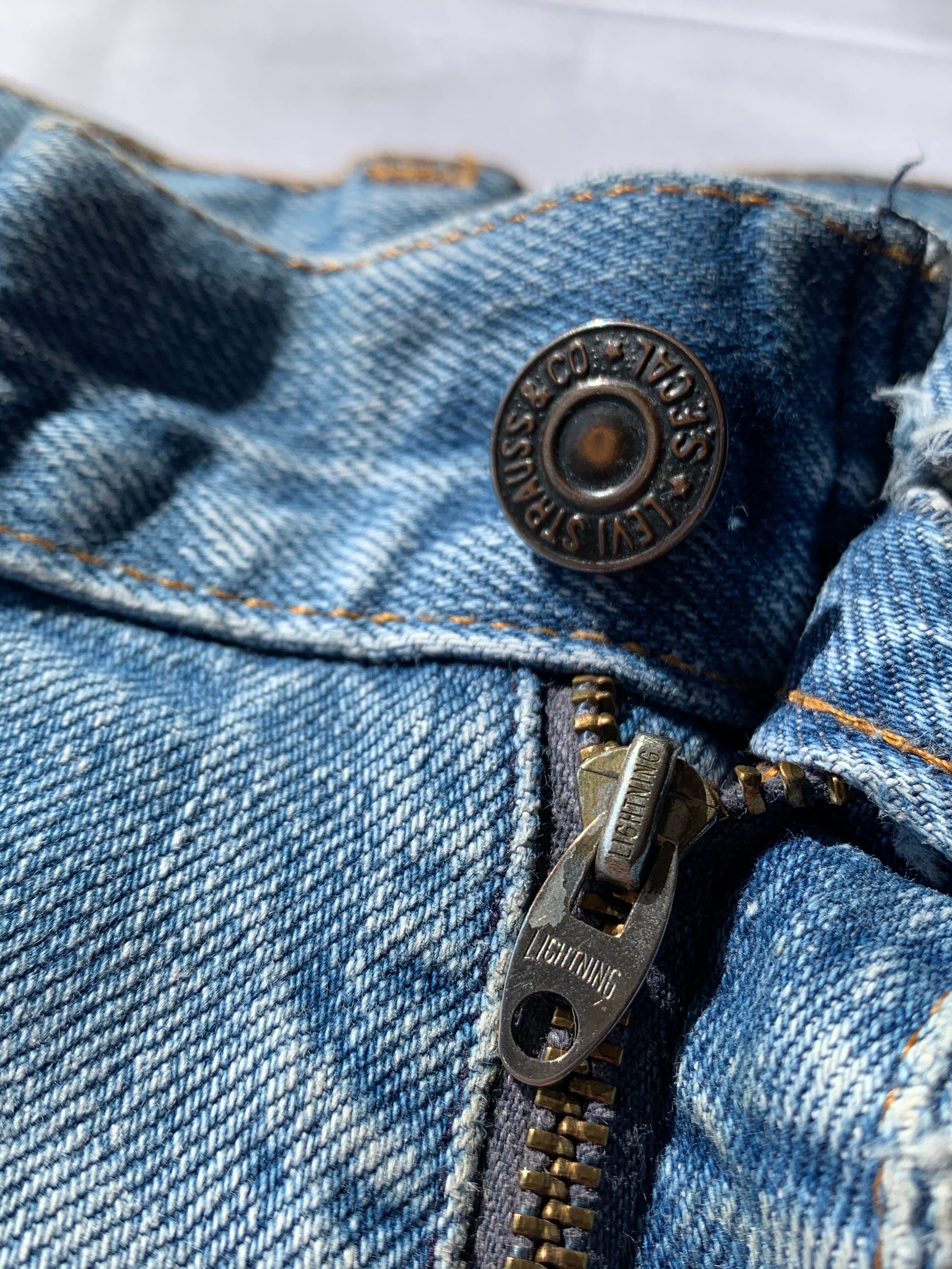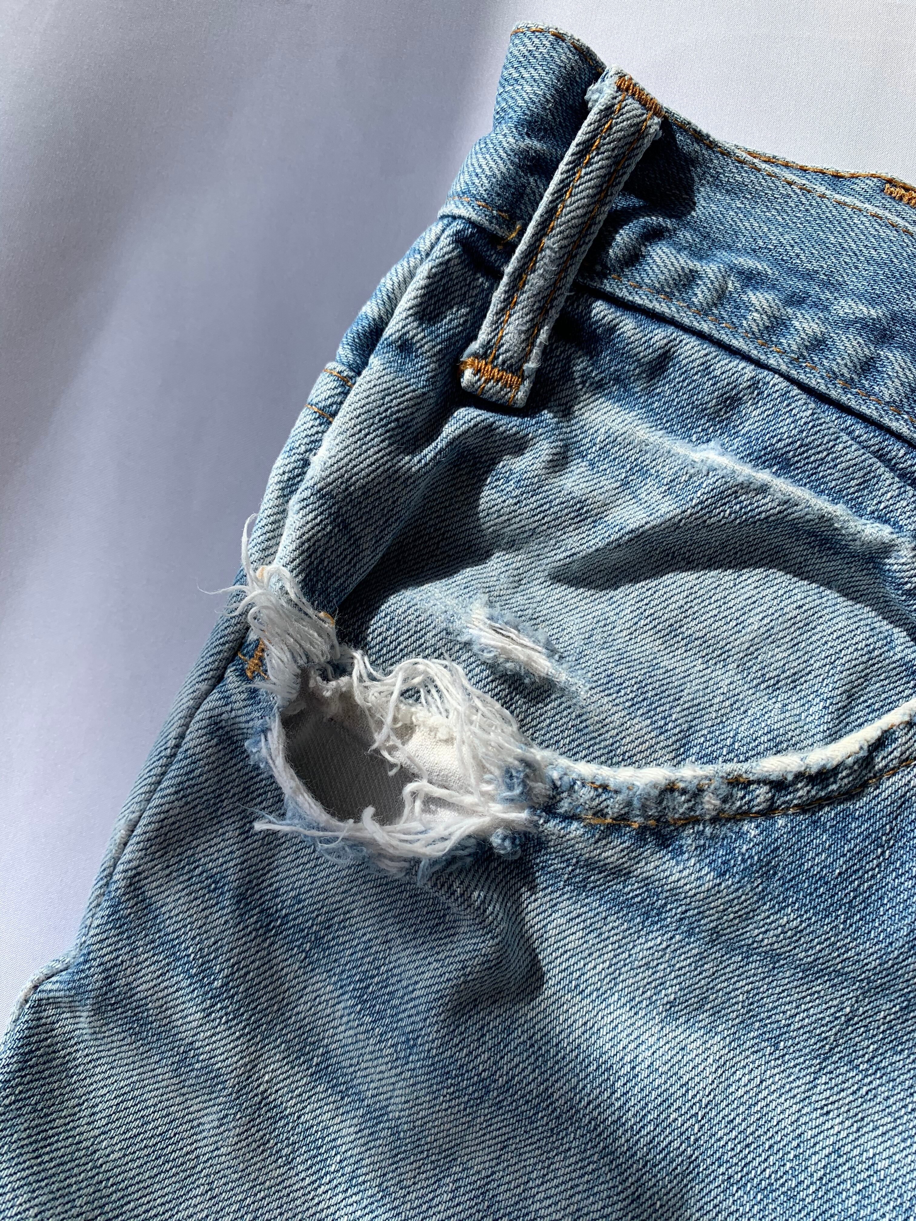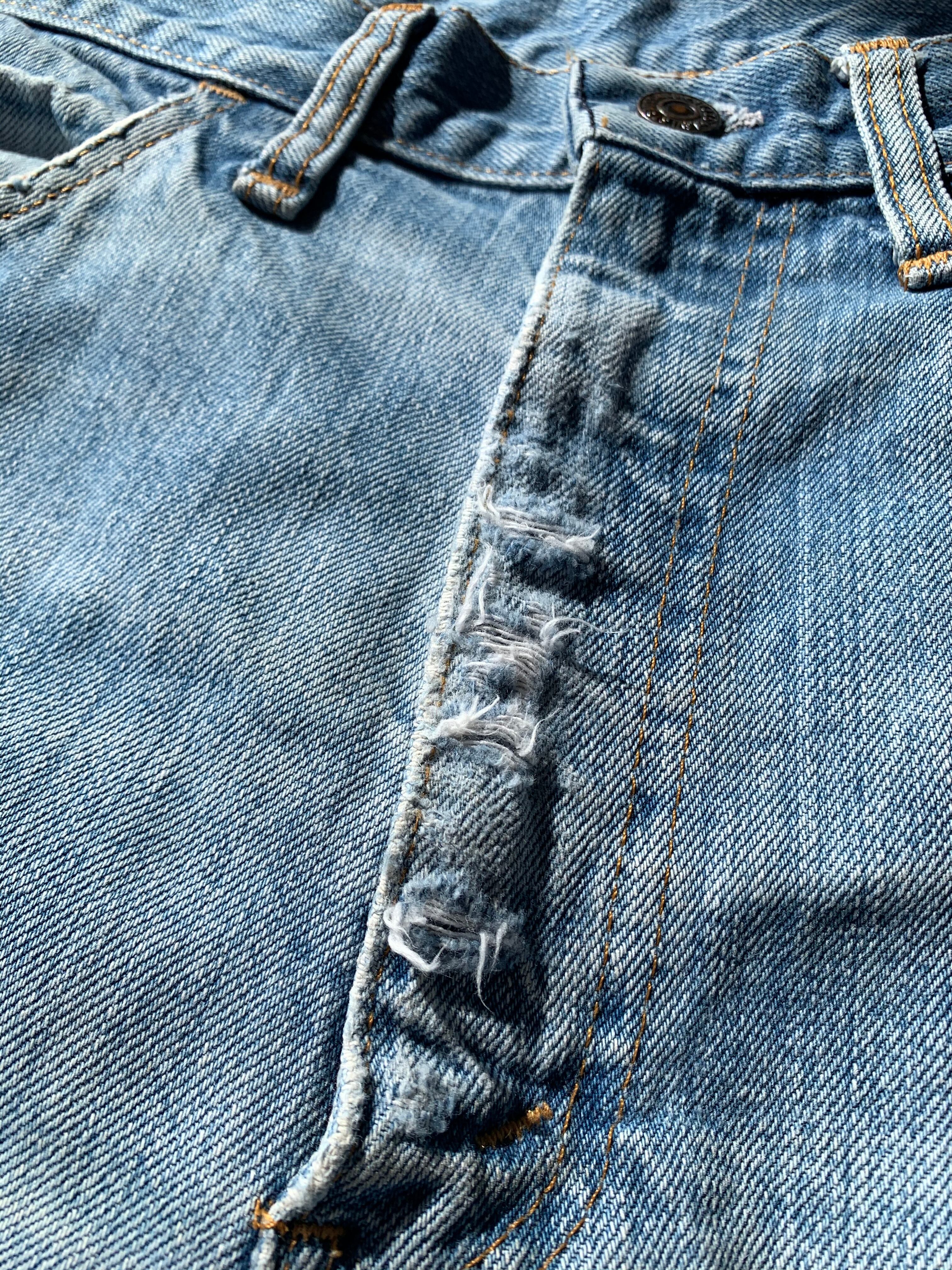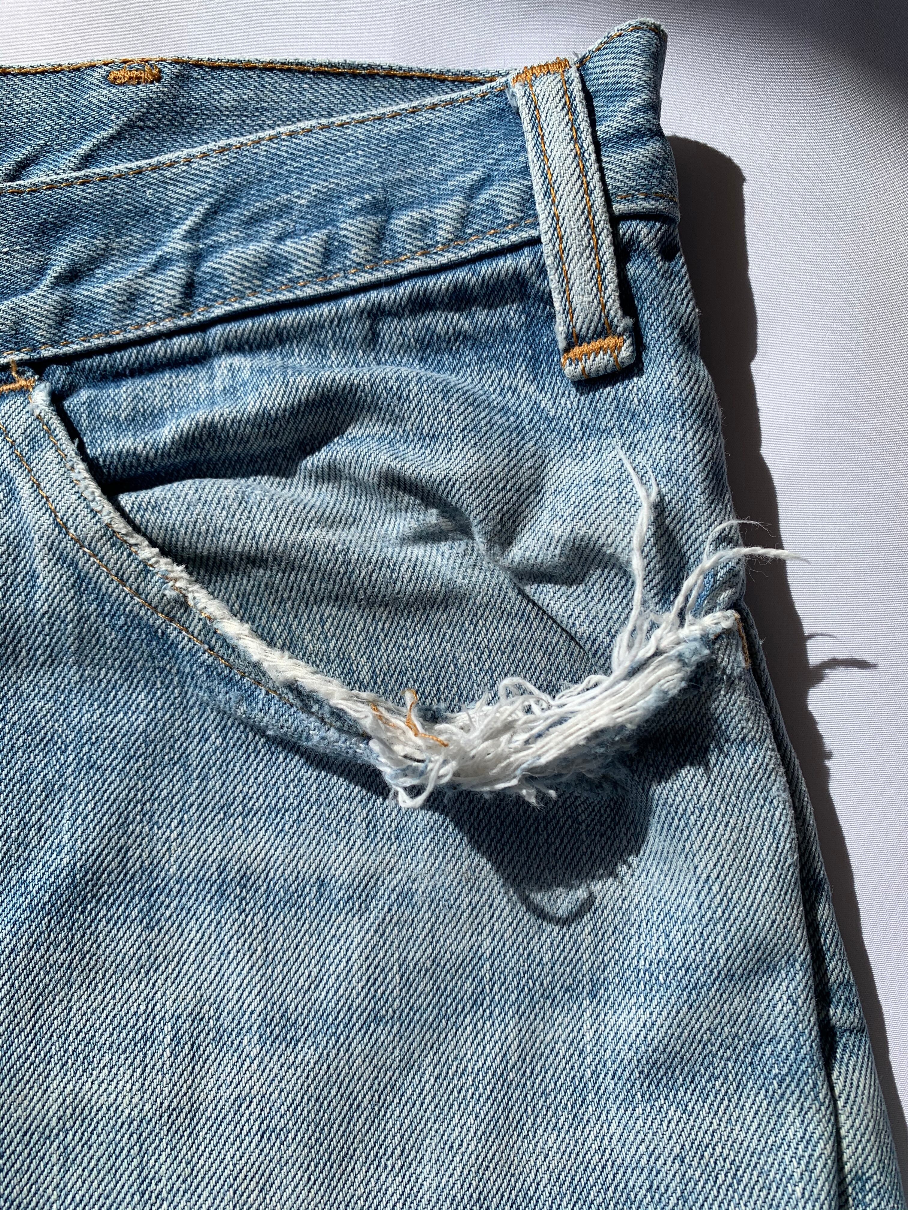 履き込まれたデニムの雰囲気、色落ち、リペア、ダメージが素晴らしい1本。