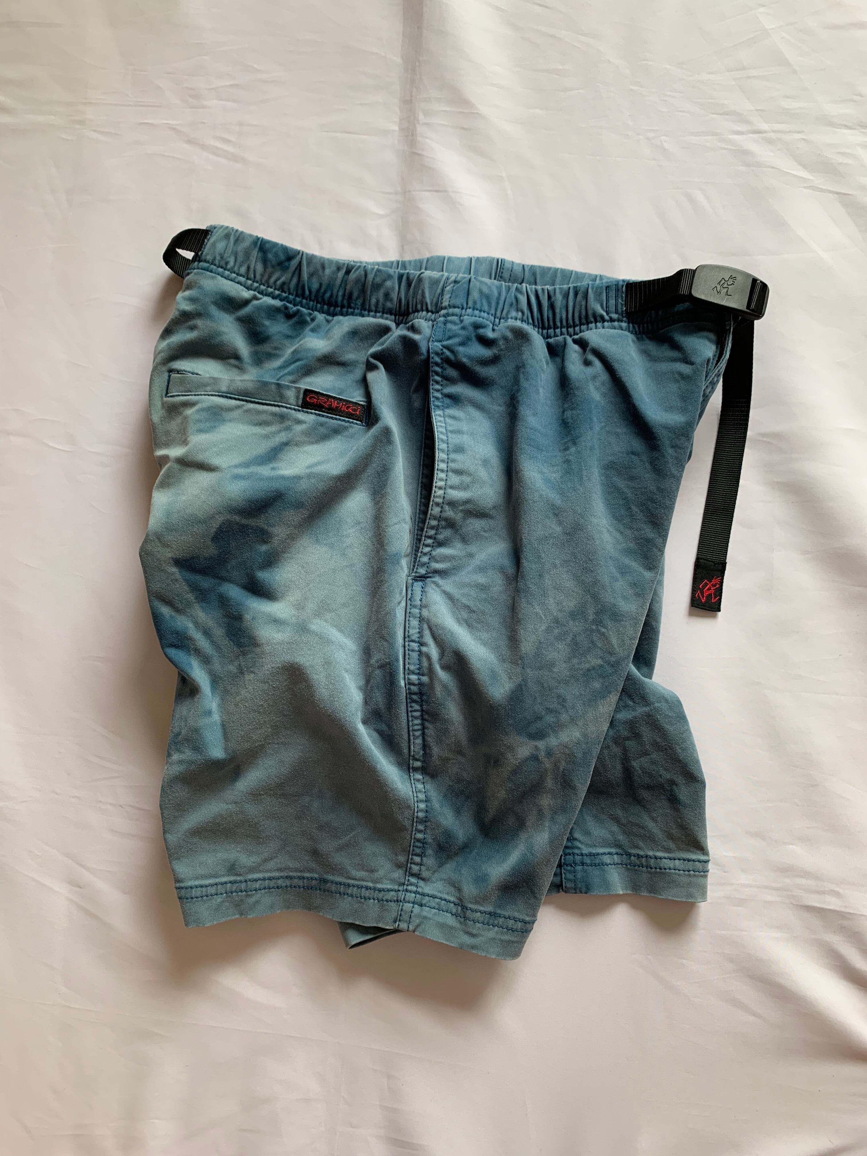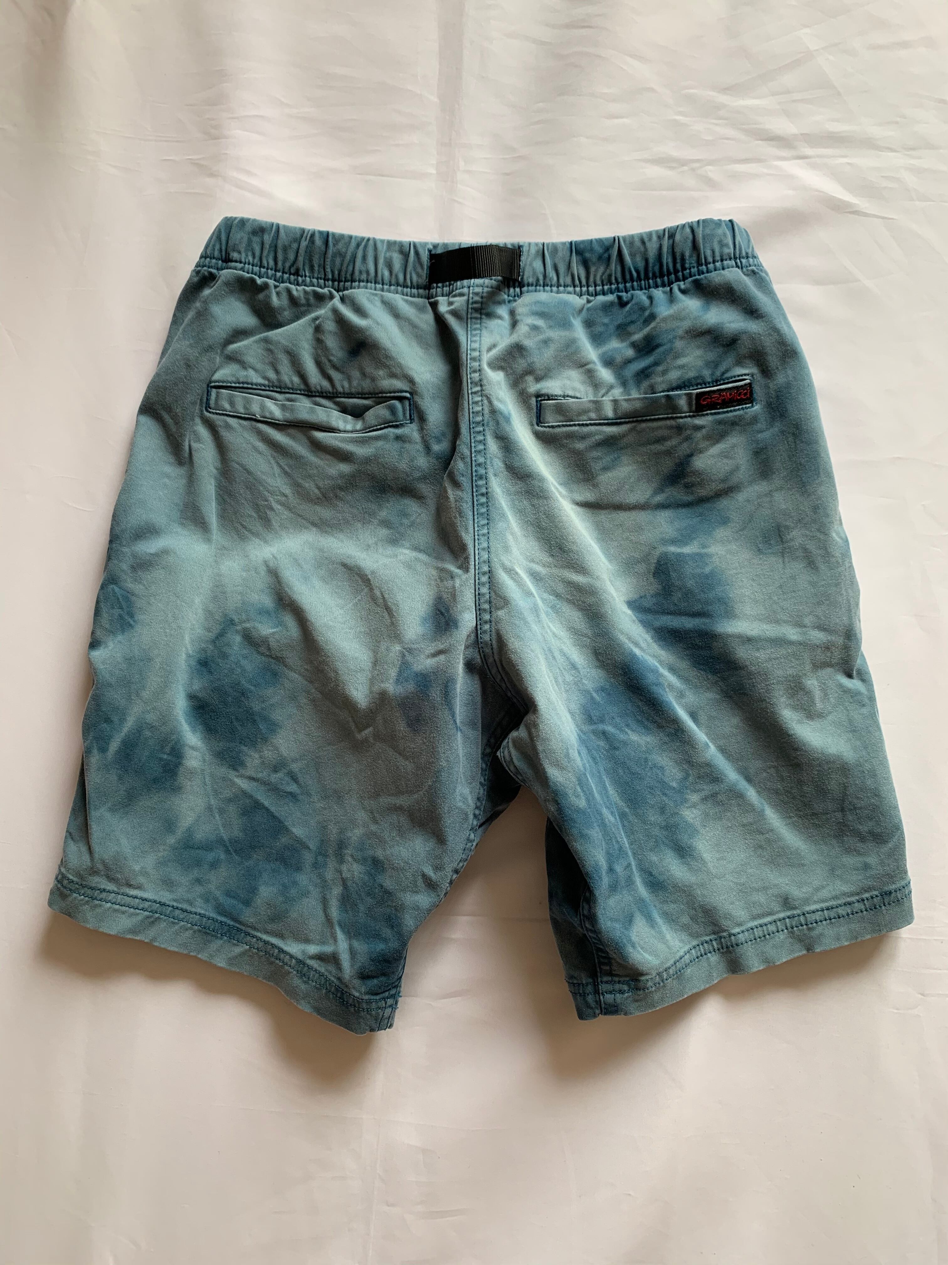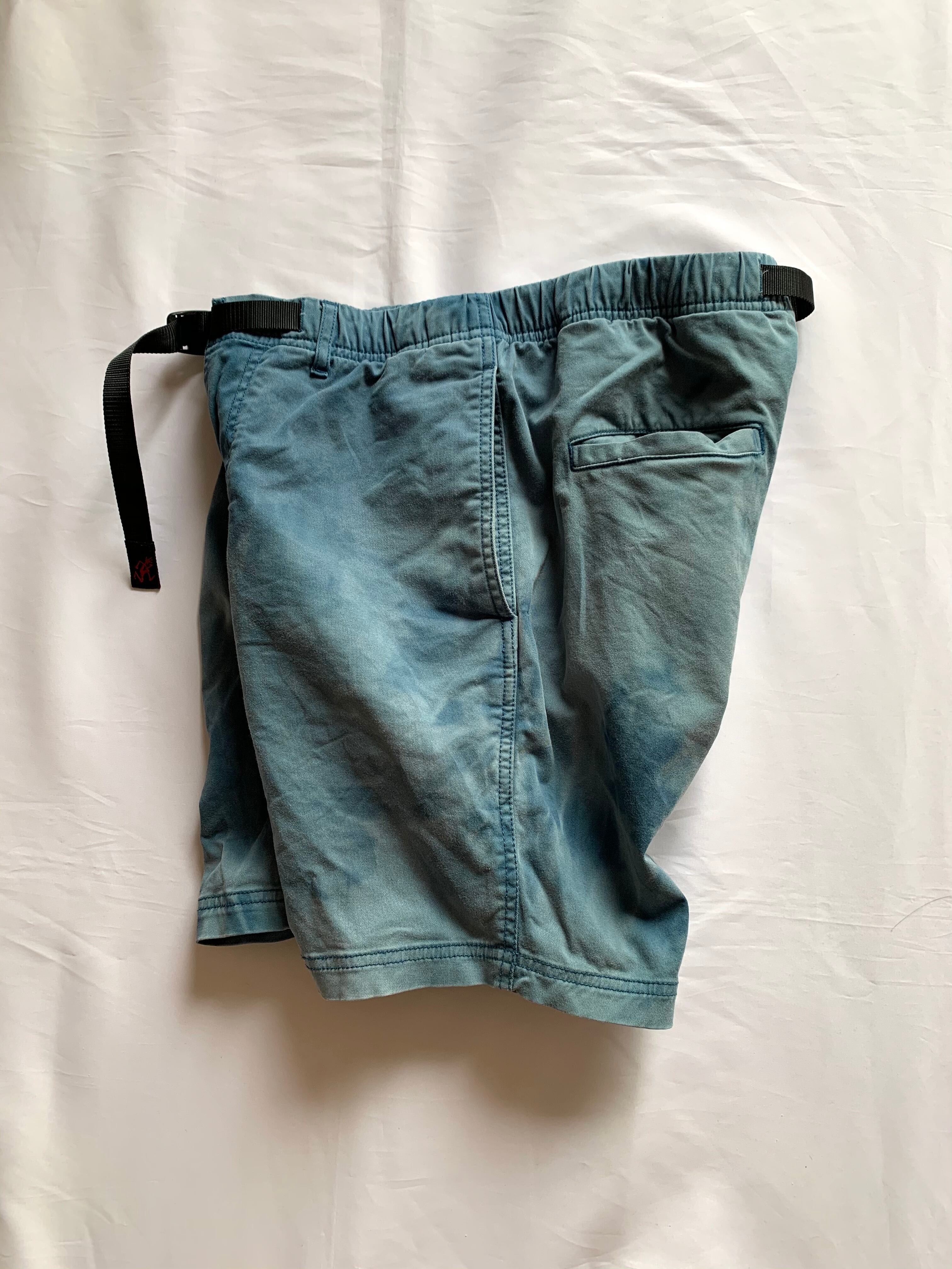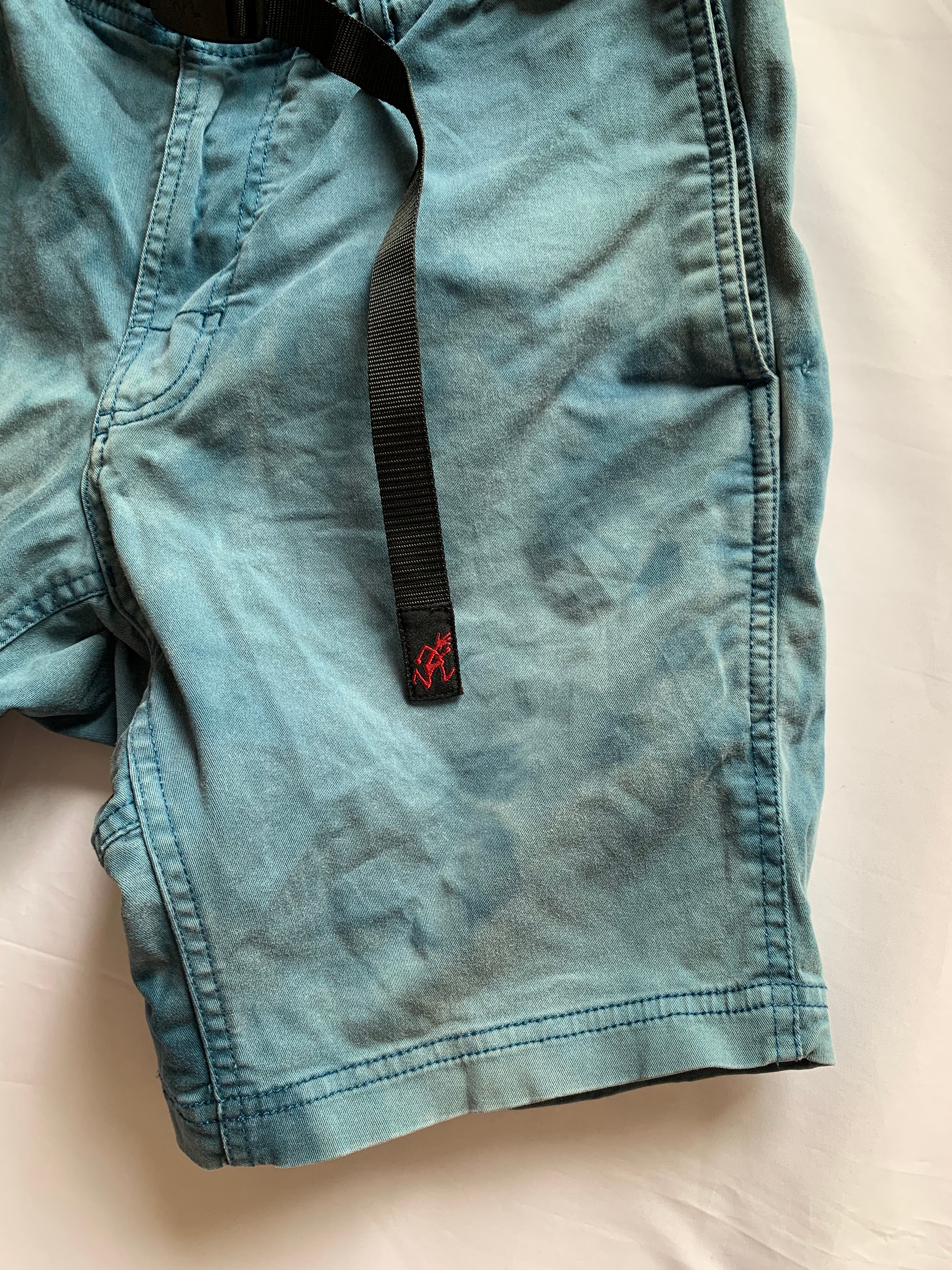 ユーズドで全体的に色落ち、色褪せ、変色、擦れ、薄い汚れがありますが特に気になるダメージはありません。サイズ表記Mで実寸サイズはウエスト約66~81cm(アジャスターで絞れます)、股上約25cm、レングス約22cm、裾幅約24.5cm、サイド総丈約43cmです。