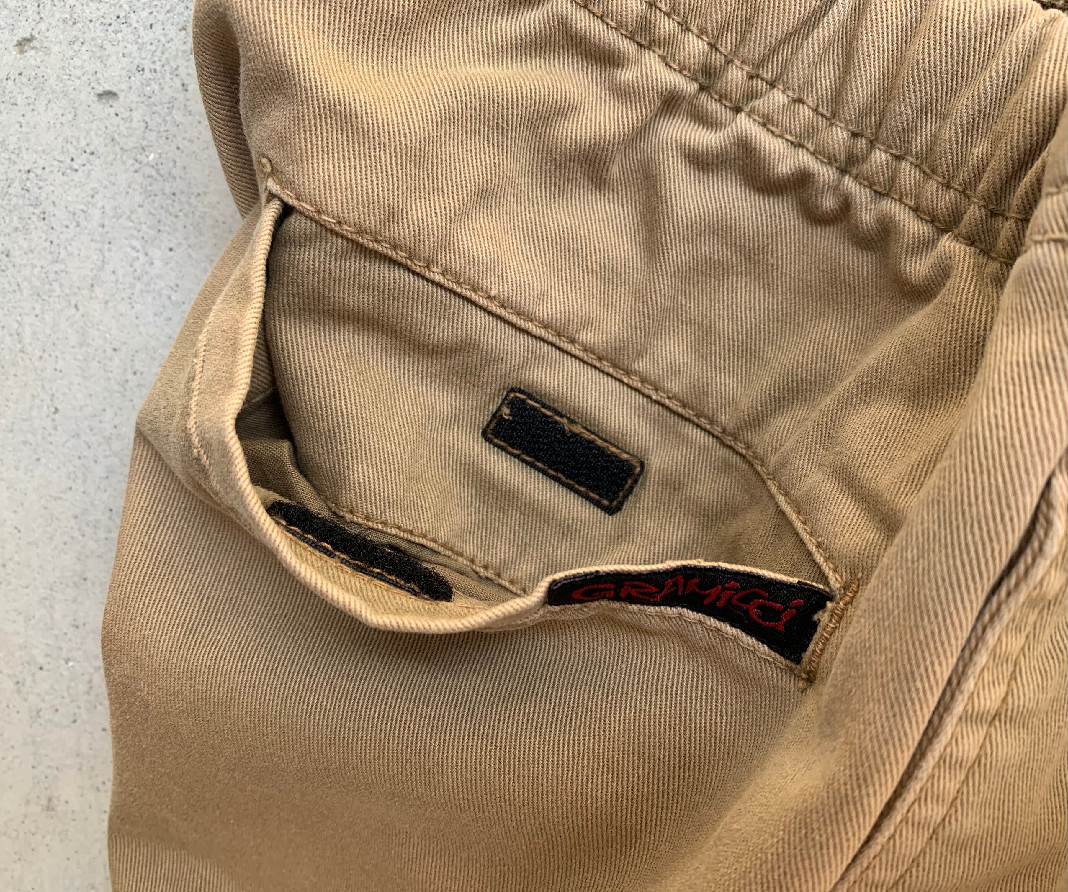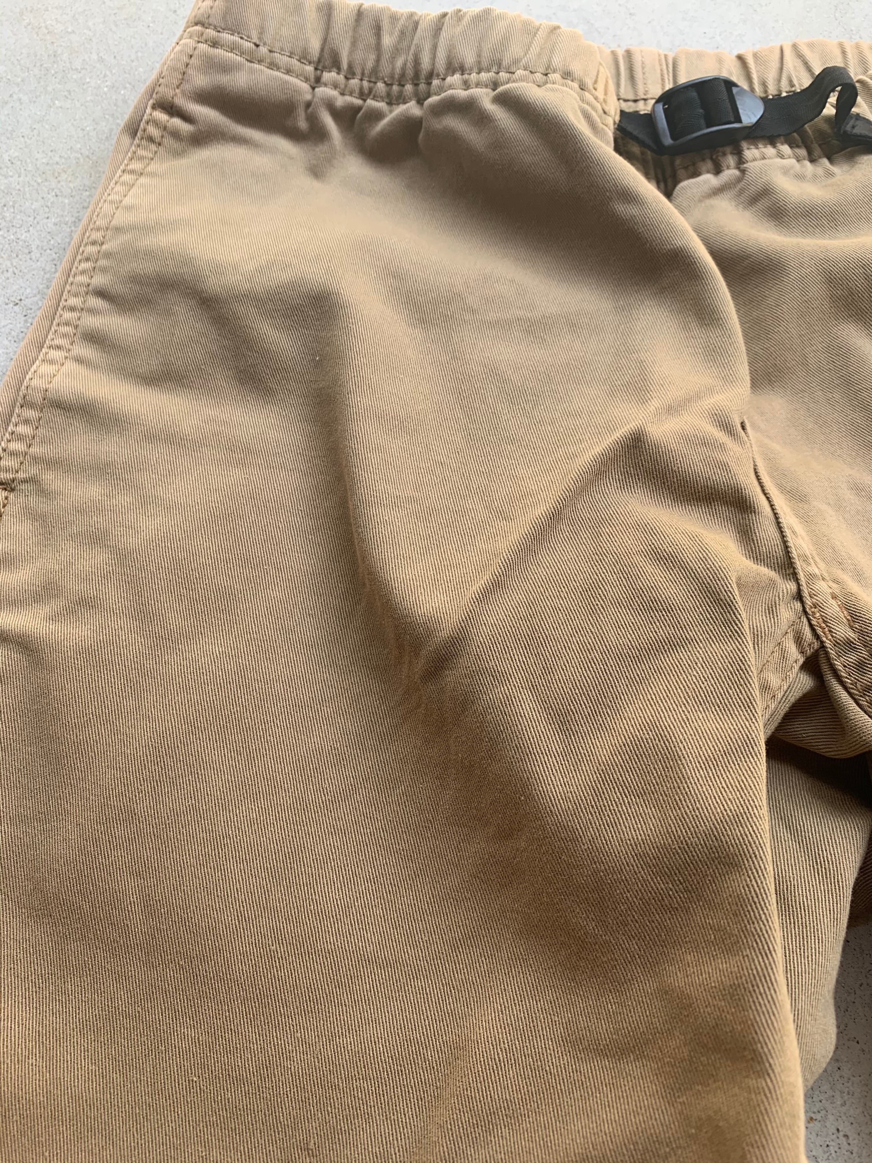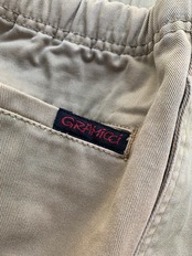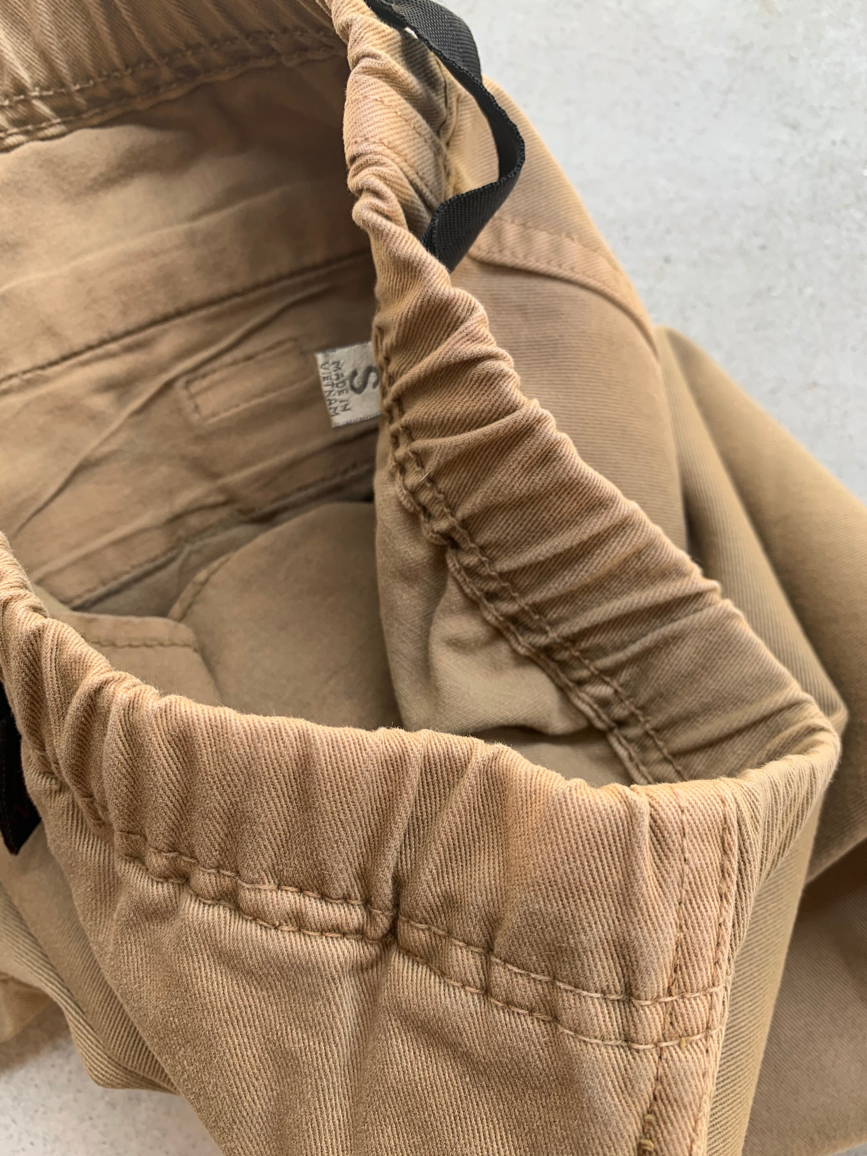 ユーズドで全体的に色落ち、色褪せ、変色、擦れ、薄い汚れがありますが特に気になるダメージはありません。サイズ表記Sで実寸サイズはウエスト約62~78cm(アジャスターで絞れます)、股上約21.5cm、レングス約19cm、裾幅約28.5cm、サイド総丈約41cmです。