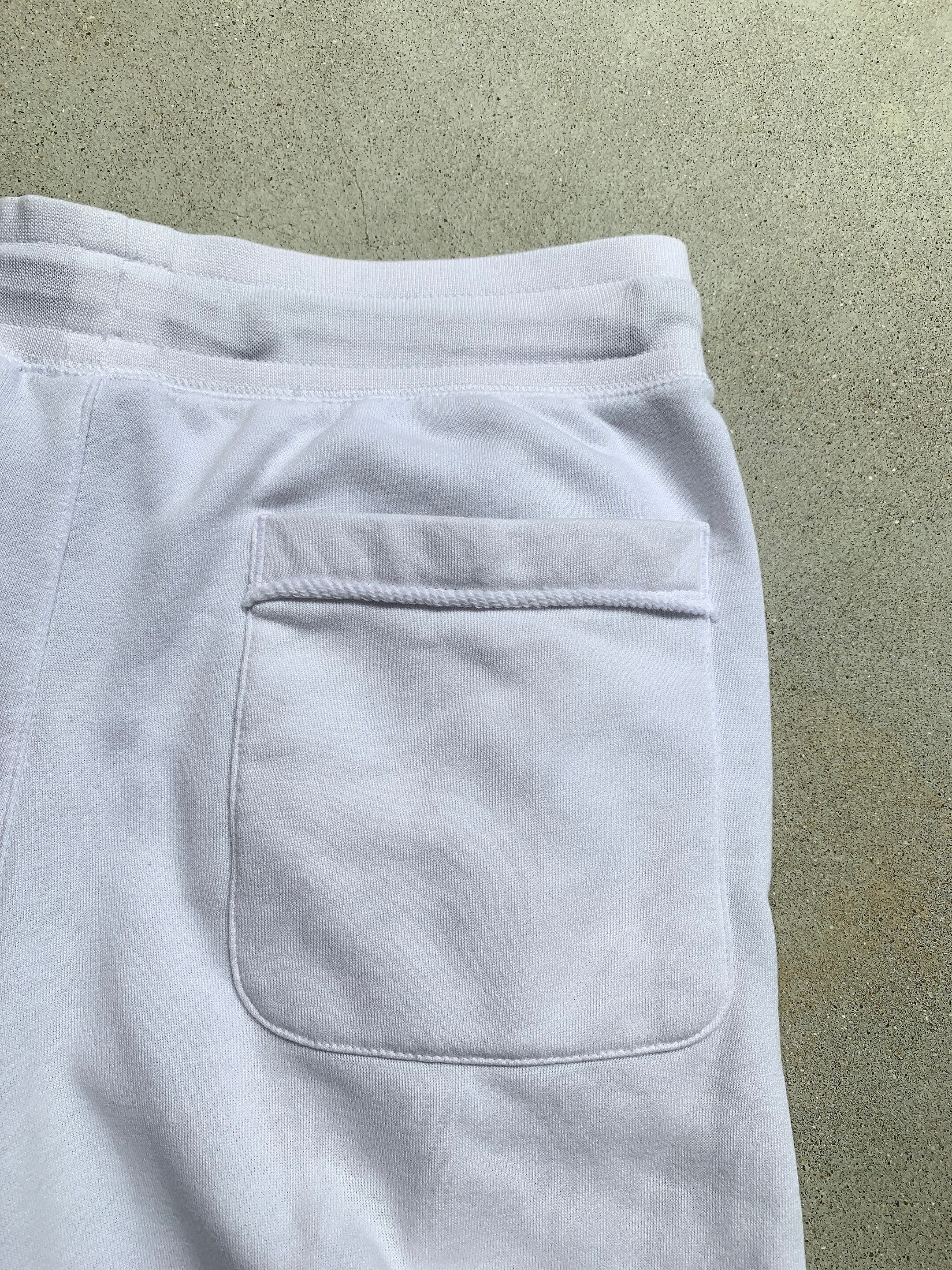 ユーズドで目立たない薄い汚れが少しありますが特に気になる汚れやダメージはありません。サイズ表記Sで実寸サイズはウエスト約65~84cm(ゴム入り紐付きで適度に紐で絞った最小サイズから適度に伸ばした最大サイズ)、股上約36.5cm、レングス約20cm、裾幅約30cm、サイド総丈約50cmです。
