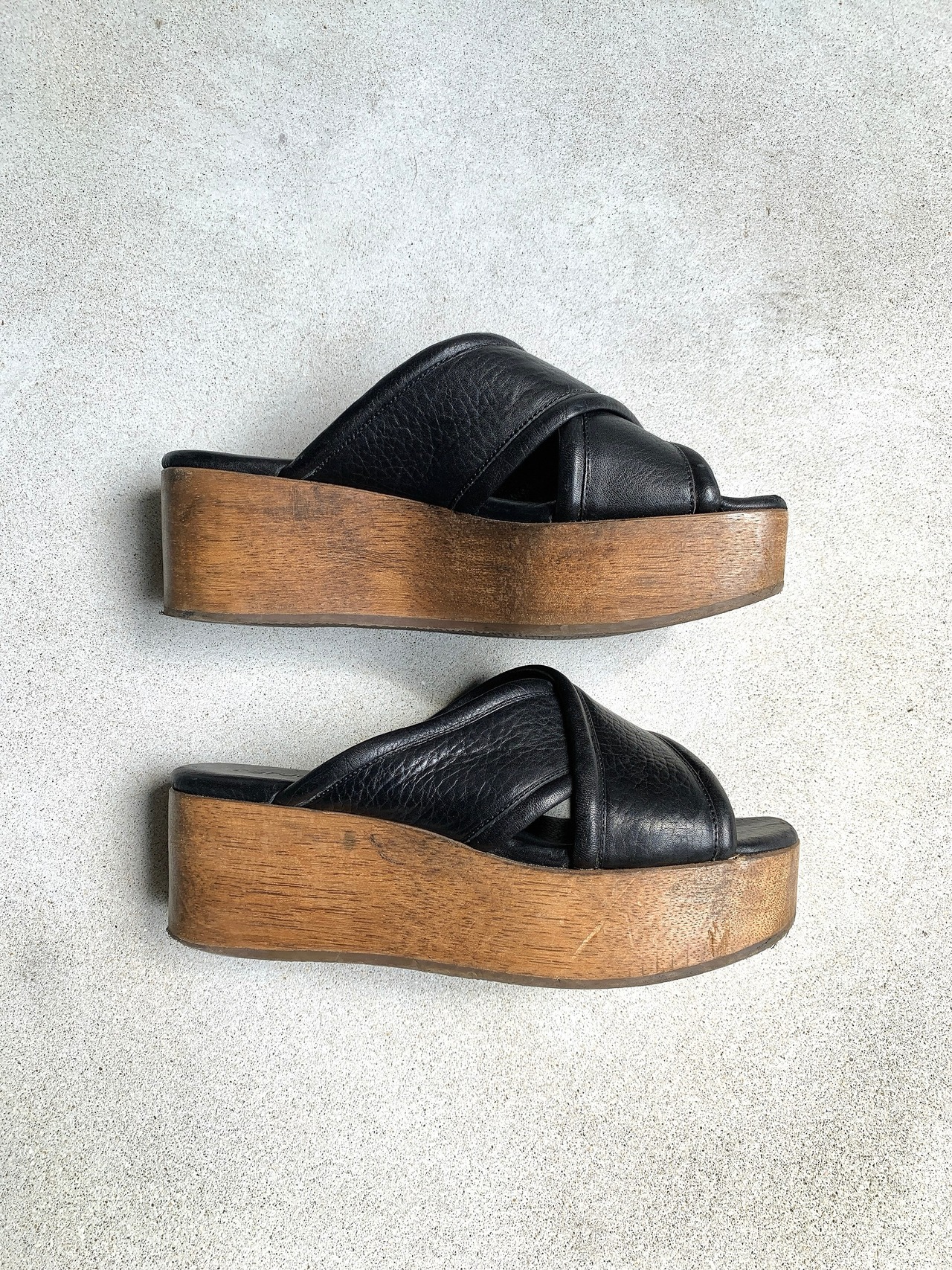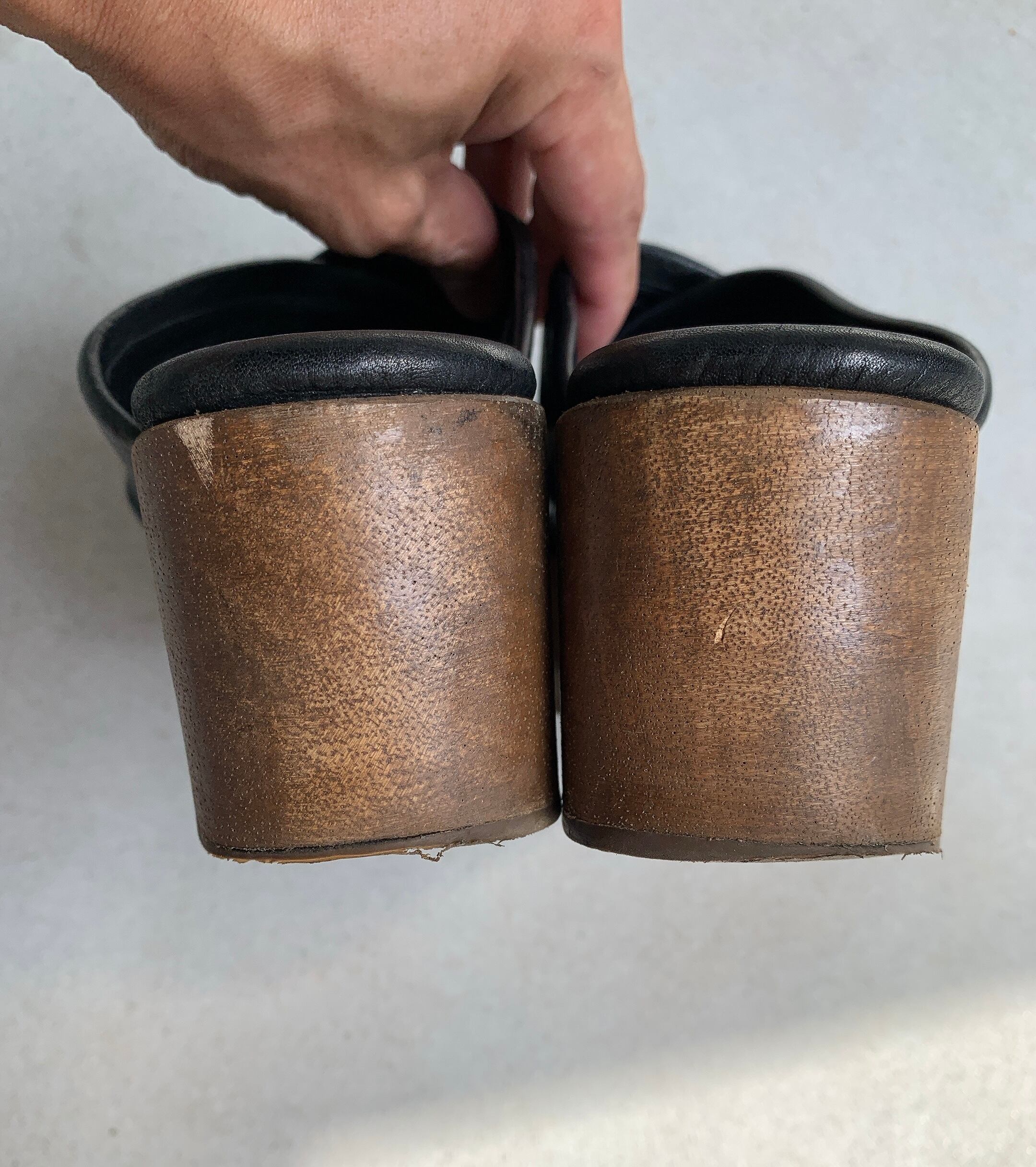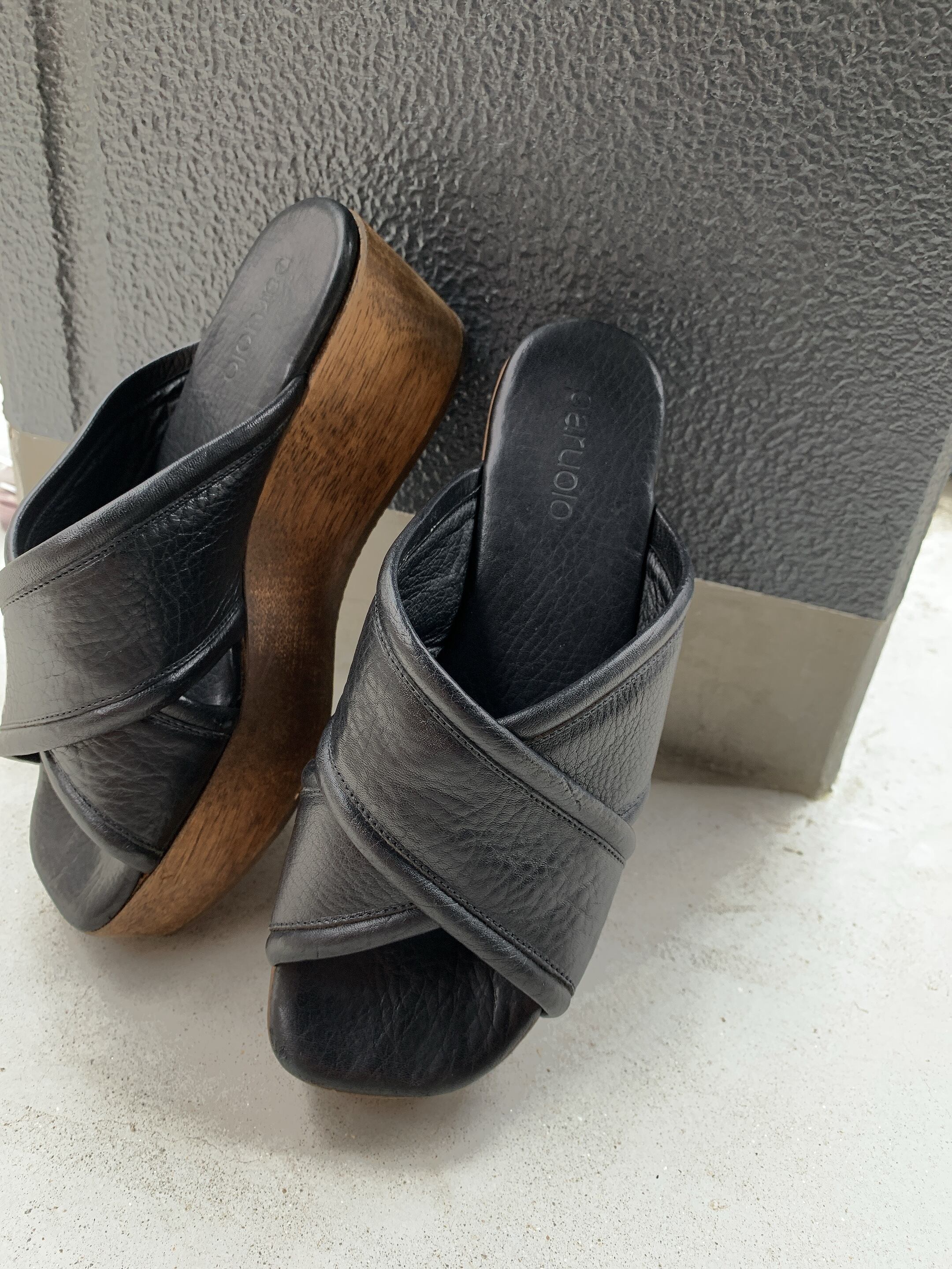 厚みのあるウッドソールにレザーが重なるデザインが素敵な1足。