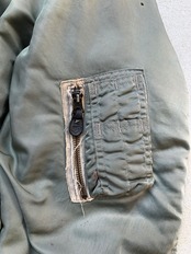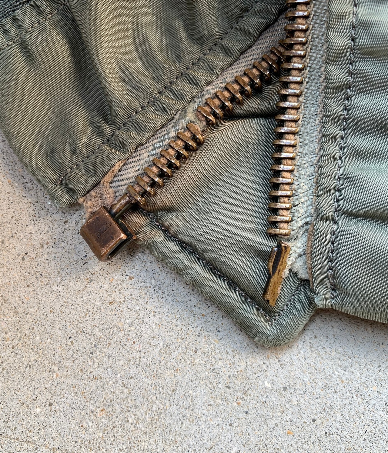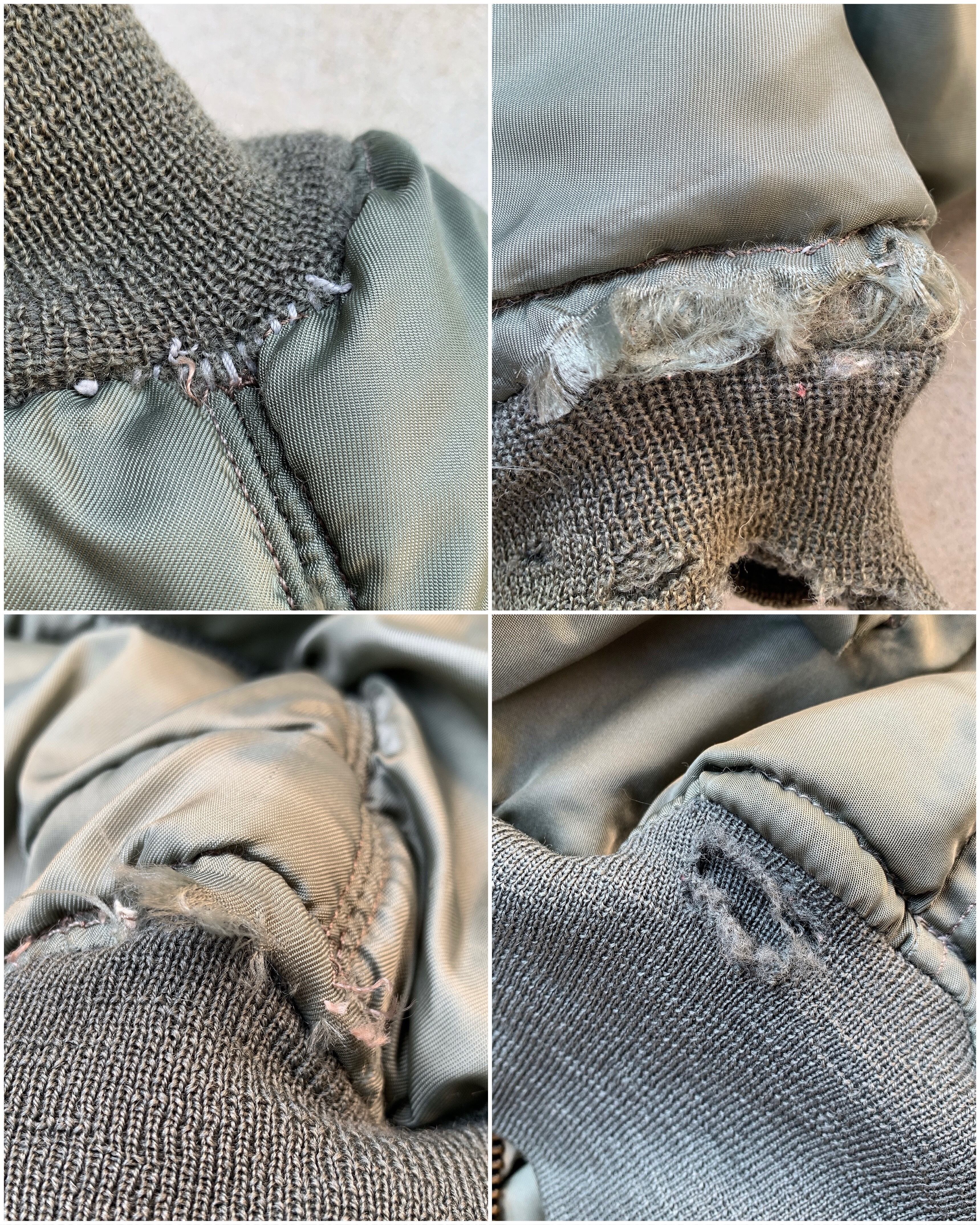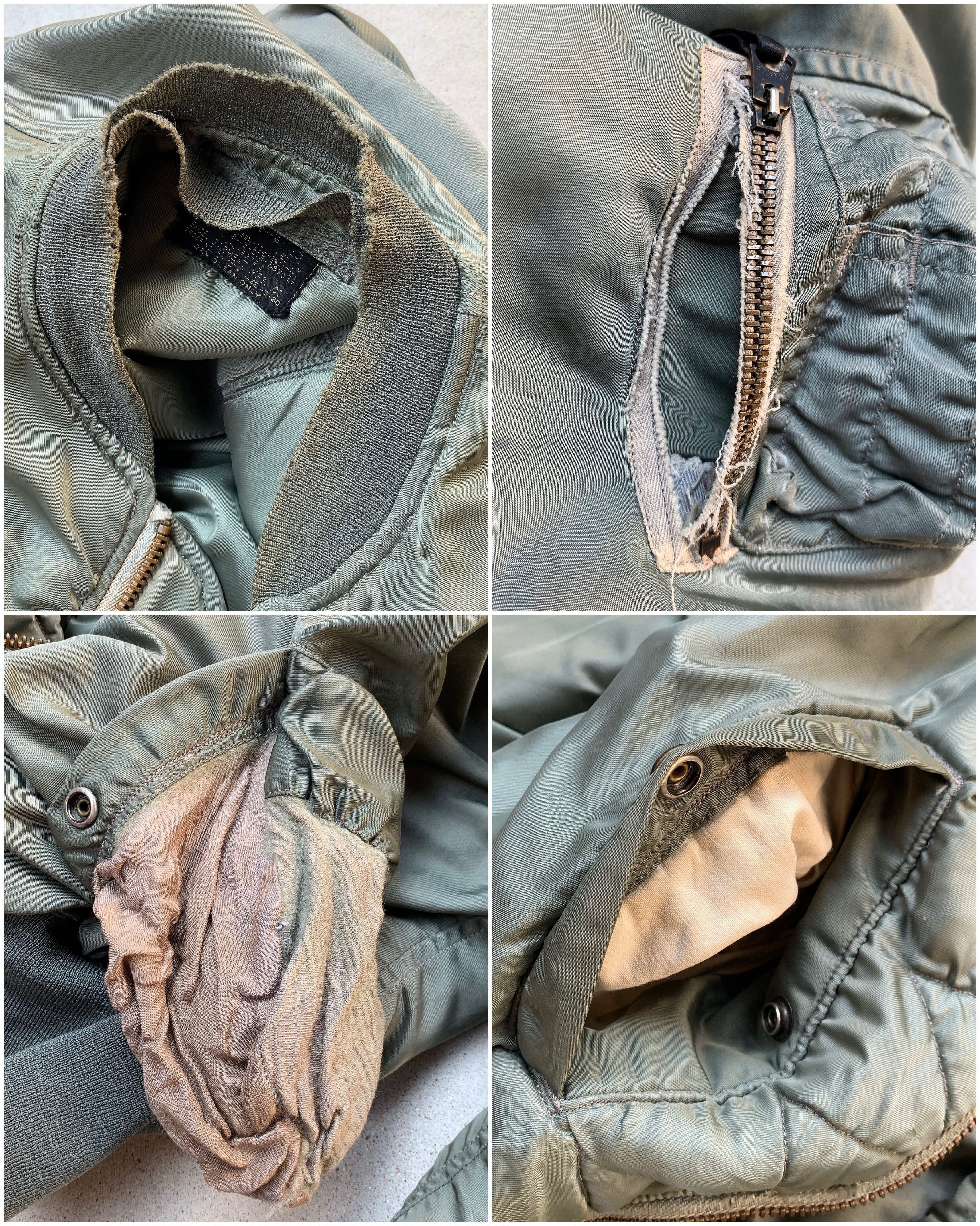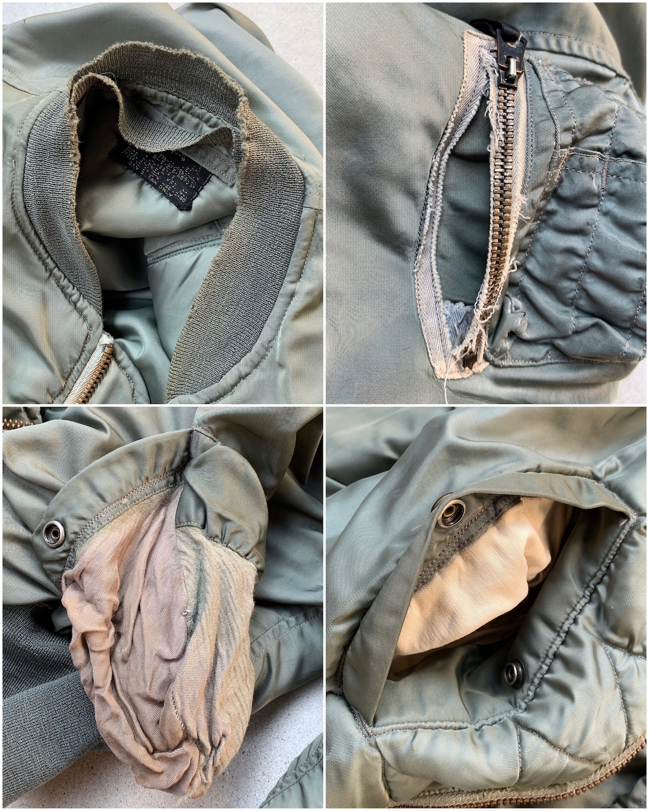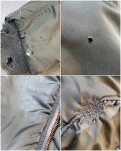 アメリカ空軍実物品のMA-1としてはコンディションは悪いですがやはり当時に着込まれておりダメージや汚れ、ジッパー破損の物が多いです。