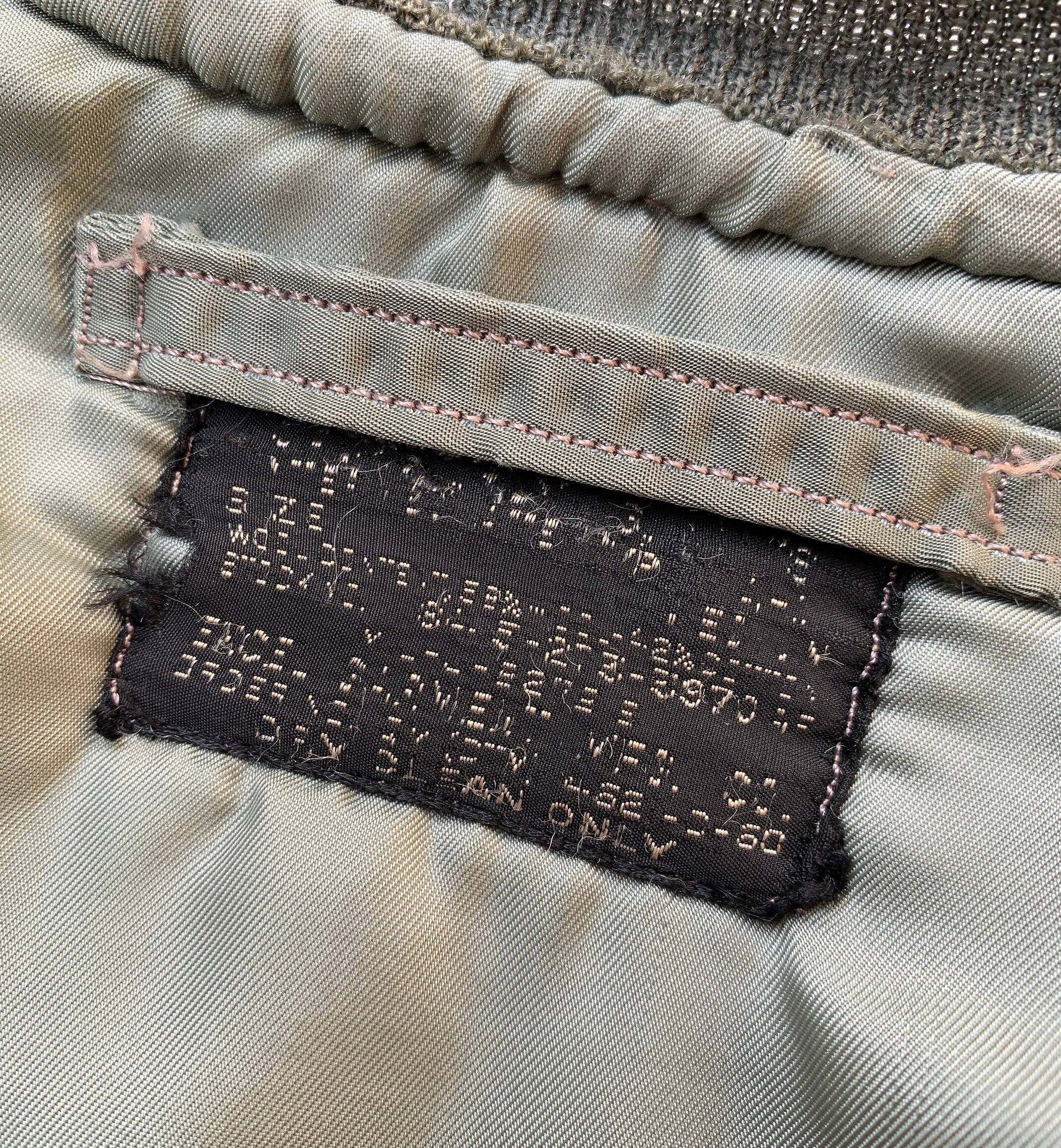 タグが擦れて読み取りにくいですが黒タグのMIL-J-8279B。EXCEL GARMENT MFG.CO.。