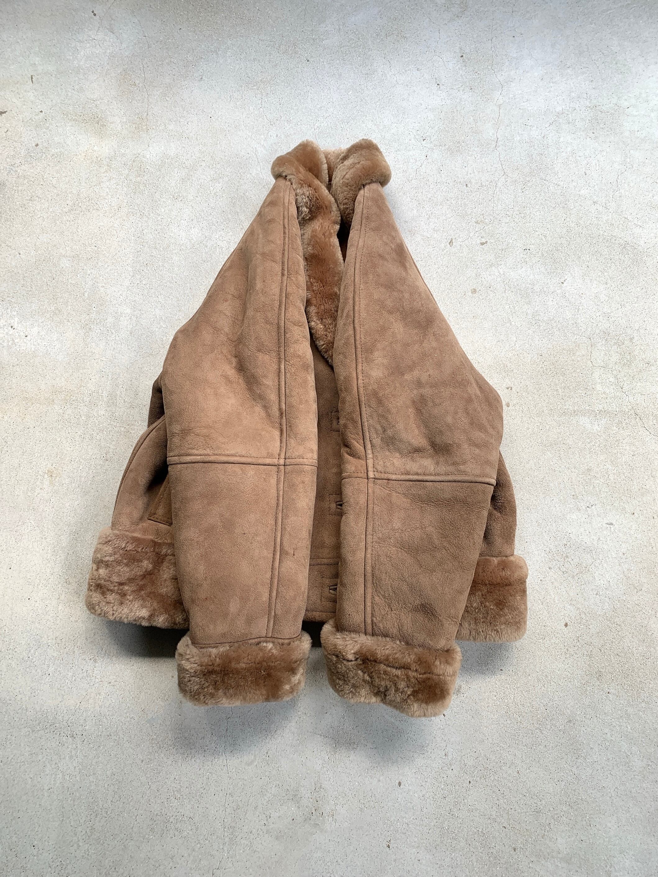 サイズ表記無しで実寸サイズは肩幅ラグラン、身幅約60cm、着丈約63cm、袖丈(脇下~袖先)約40cm、袖先を折らずに伸ばすと約48cmです。