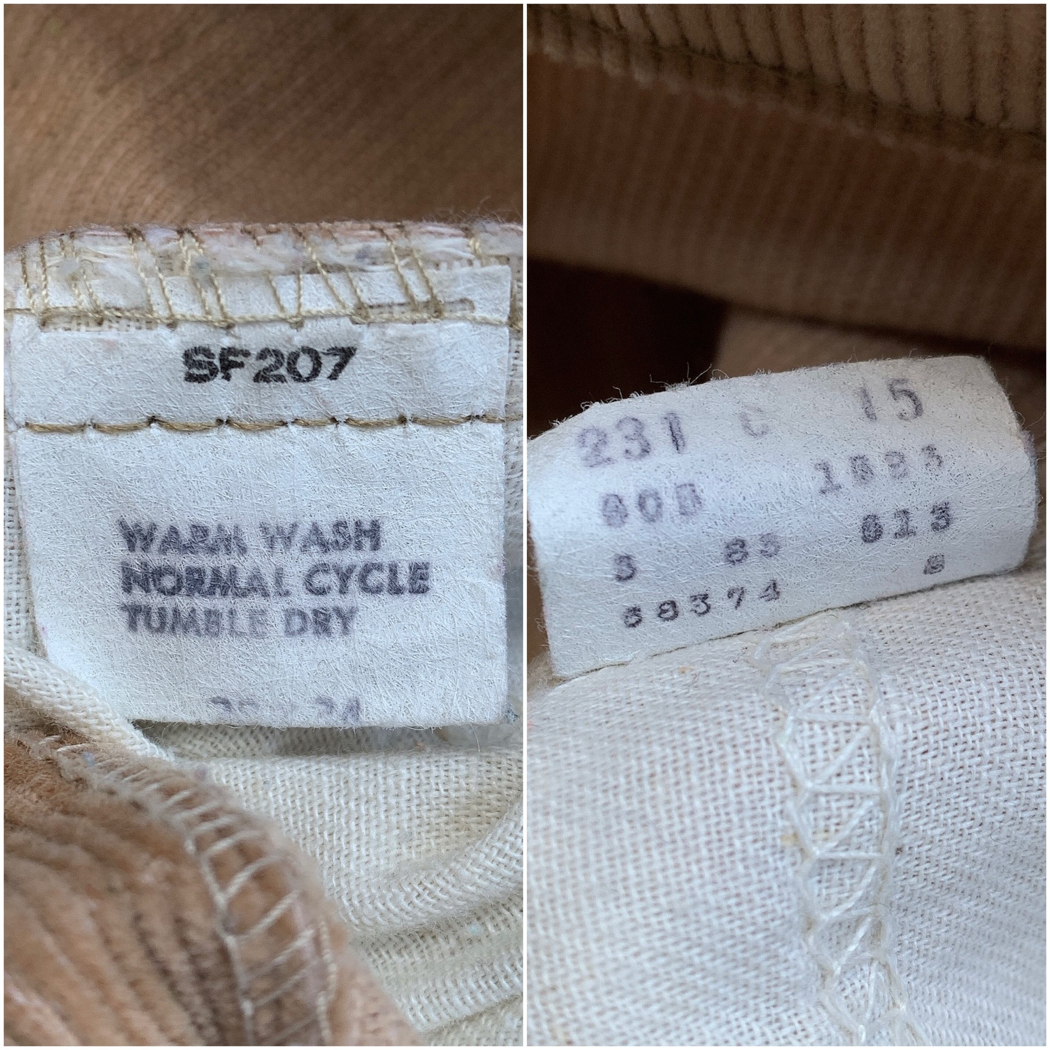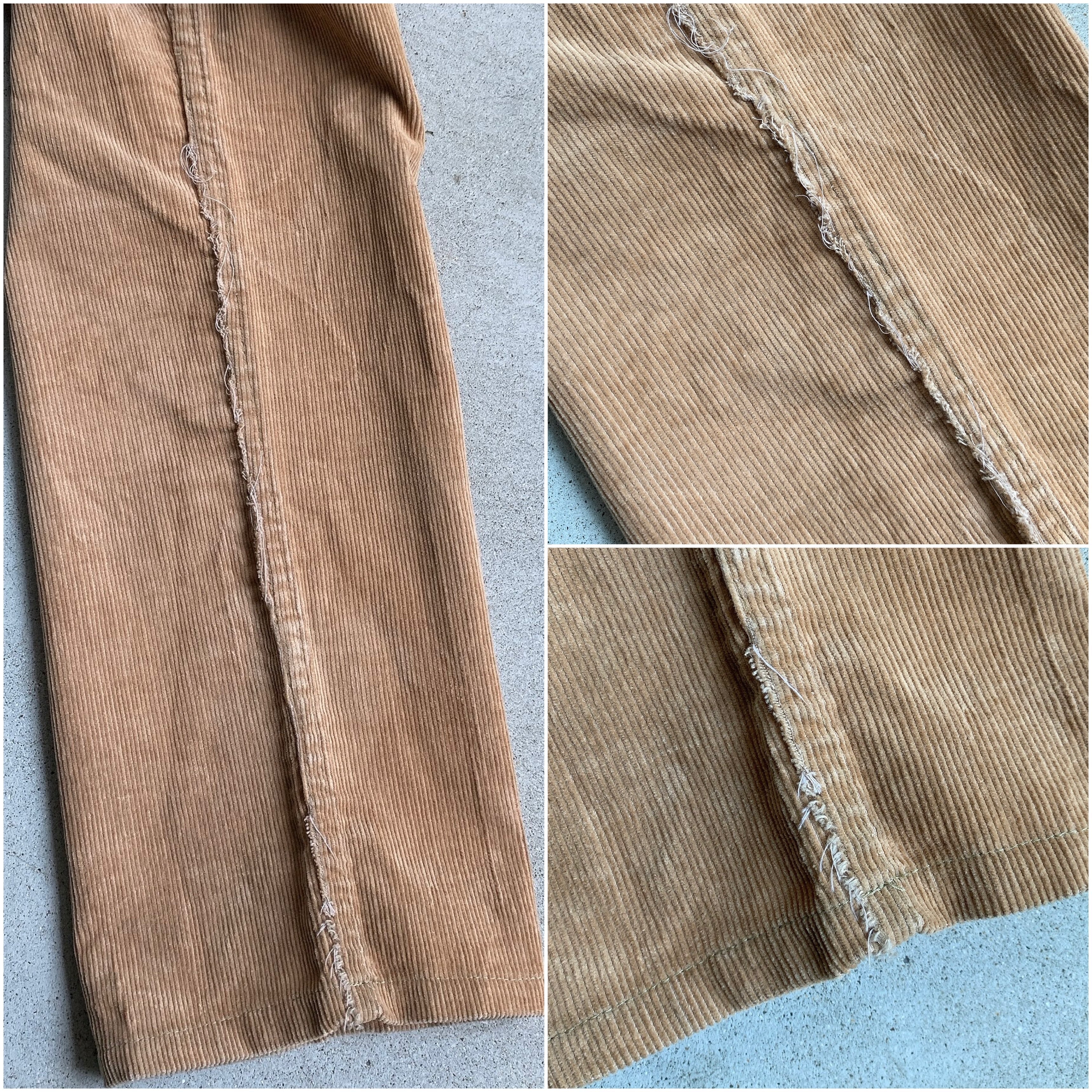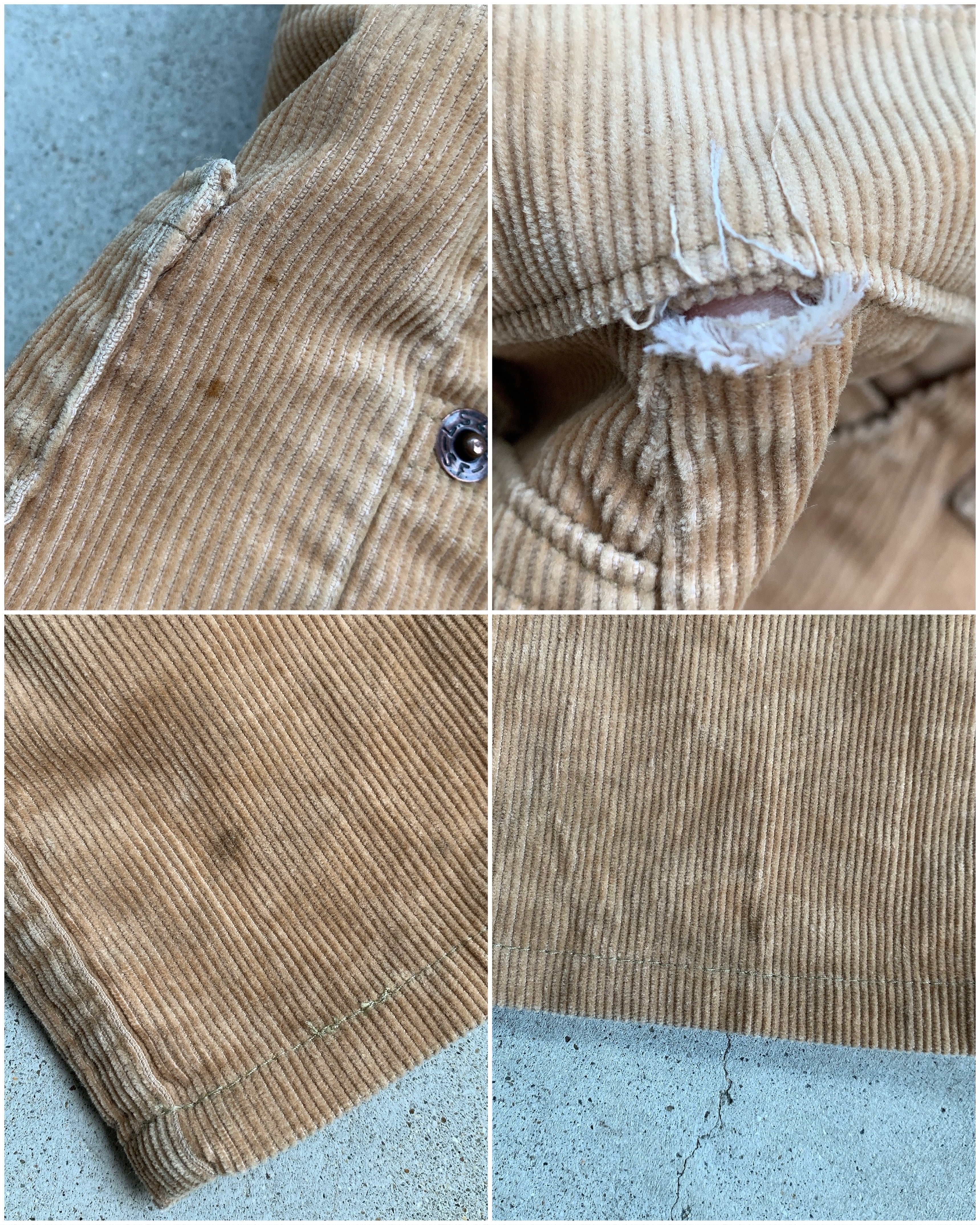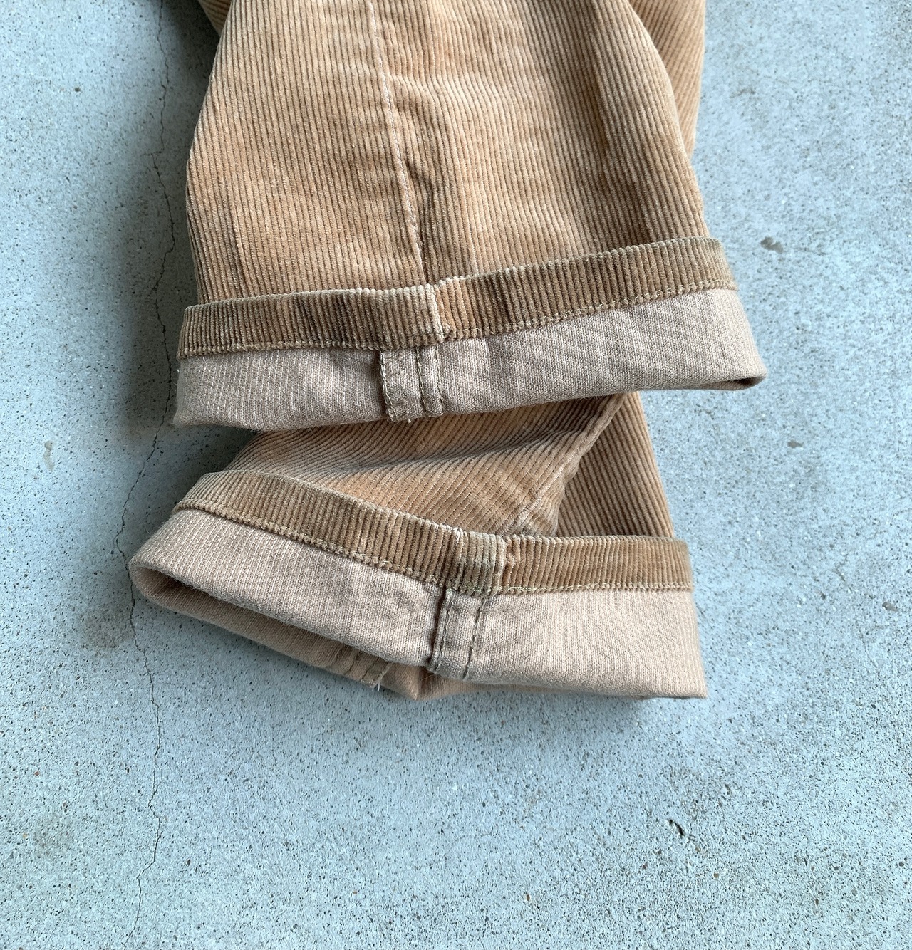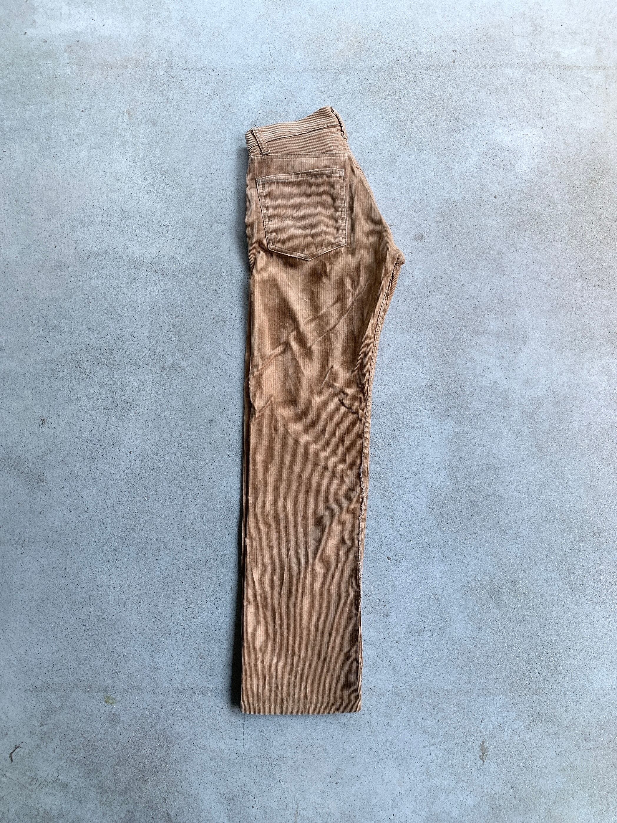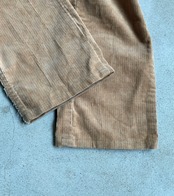 ユーズドでコーデュロイパンツ特有の粗い色落ち、色褪せ、色抜けがあります。多少の薄い汚れがあります。両裾先にも汚れがあります。左足の内側に擦れと糸のほつれがあります。右サイド腰付近にほつれによる小穴があります。多少のシワもありますが特に気になる汚れやダメージはありません。サイズ表記ウエスト28、レングス34で実寸サイズはウエスト約72cm、股上約27cm、レングス約74.5cm、裾幅約18cm、サイド総丈約100cmです。