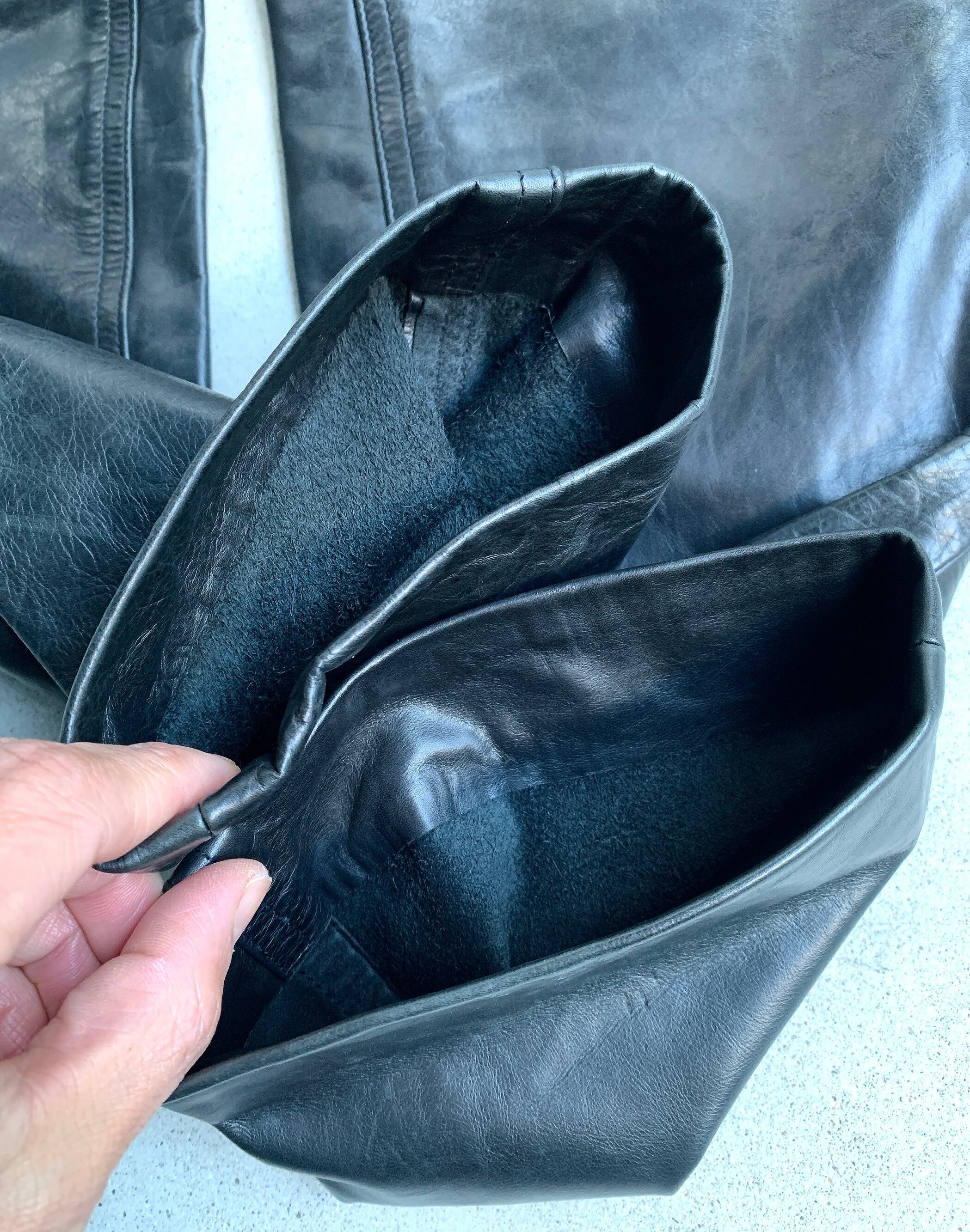 裾先はこの手のレザーパンツでよく見られる切りっぱなしを折り返してる仕上げ。