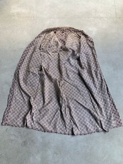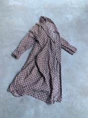 落ち着いた渋い色合いの総柄のロング丈のガウンは個性的でインパクトある1着。