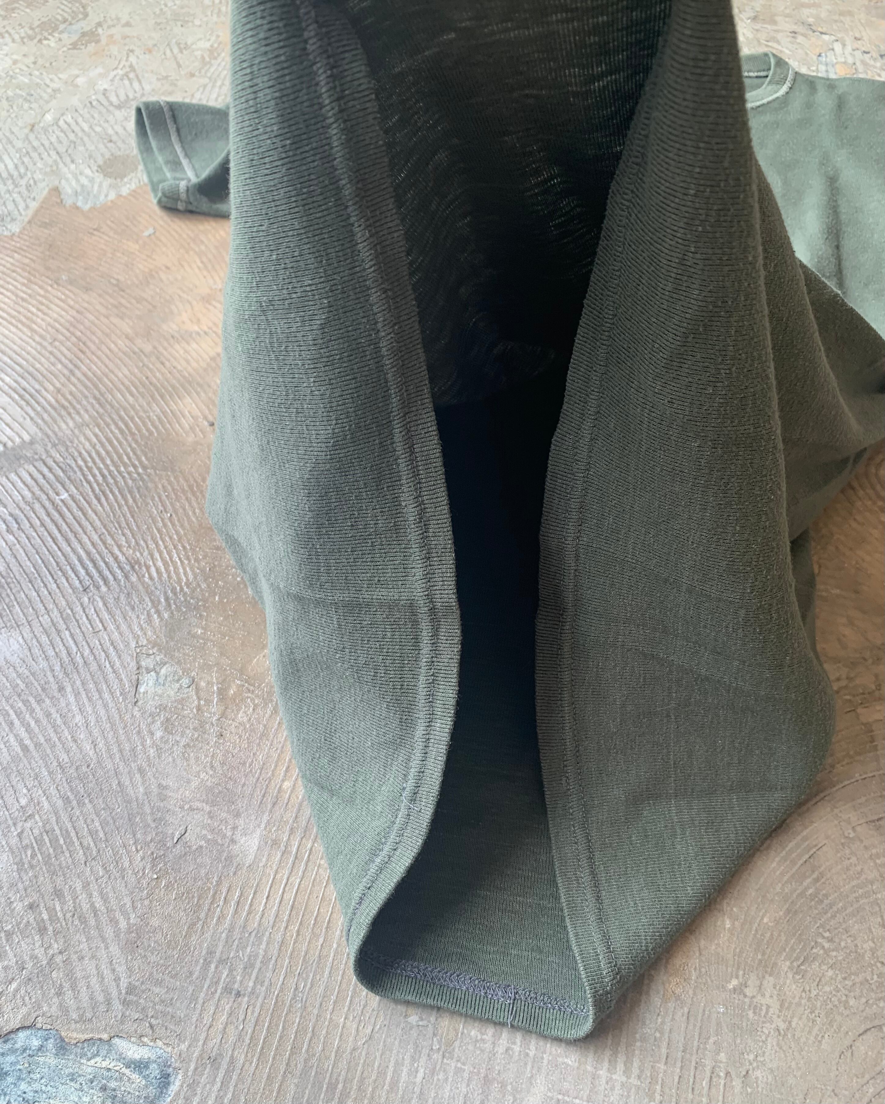 この手のアンダーシャツはホワイト、クリームが主流ですが今回はオリーブ。