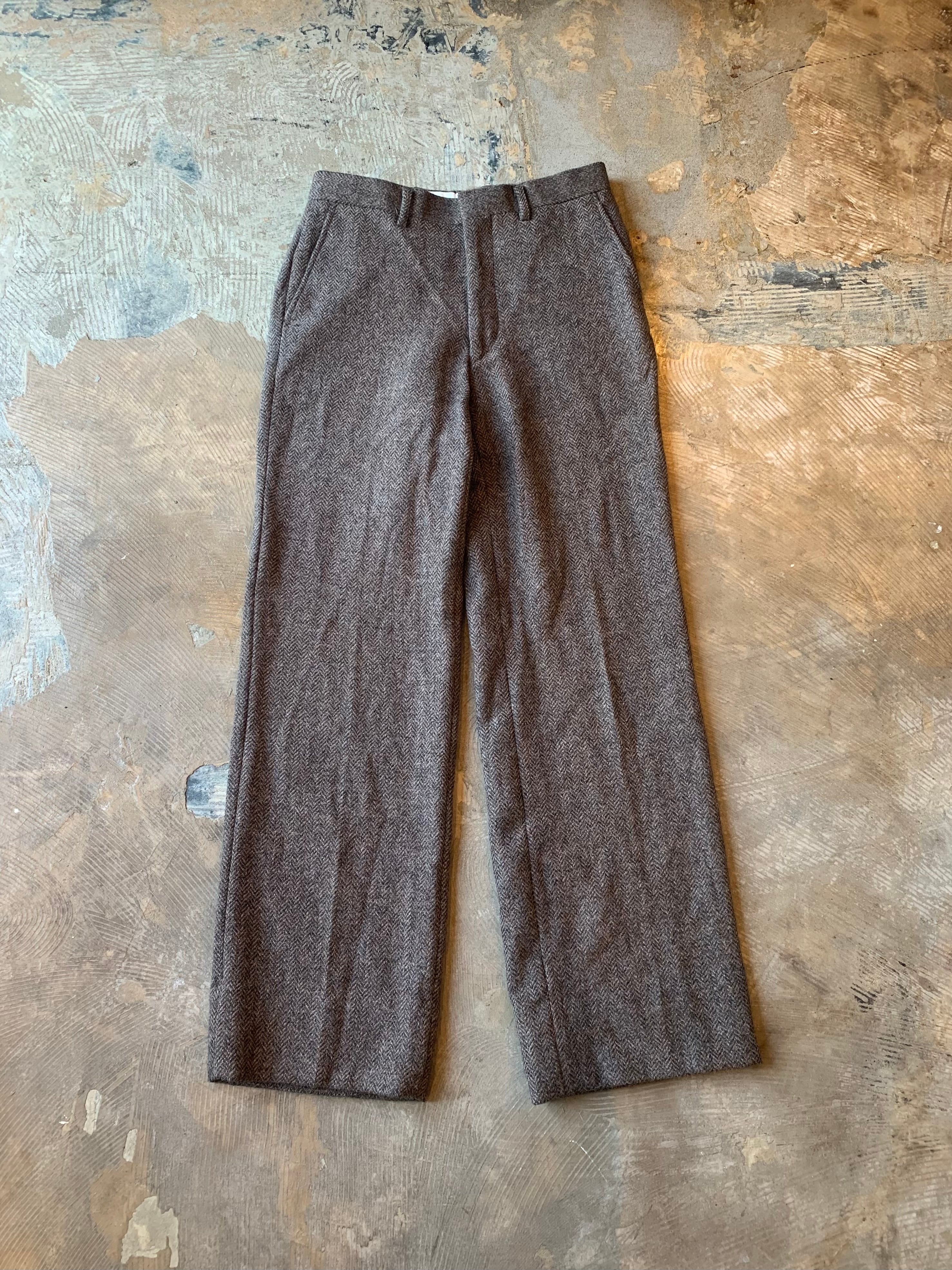 ガシッとした厚手のウール地でヘリンボーン柄、落ち着いたカラーリング、少しワイドなストレートシルエットでオトナな雰囲気です‼︎