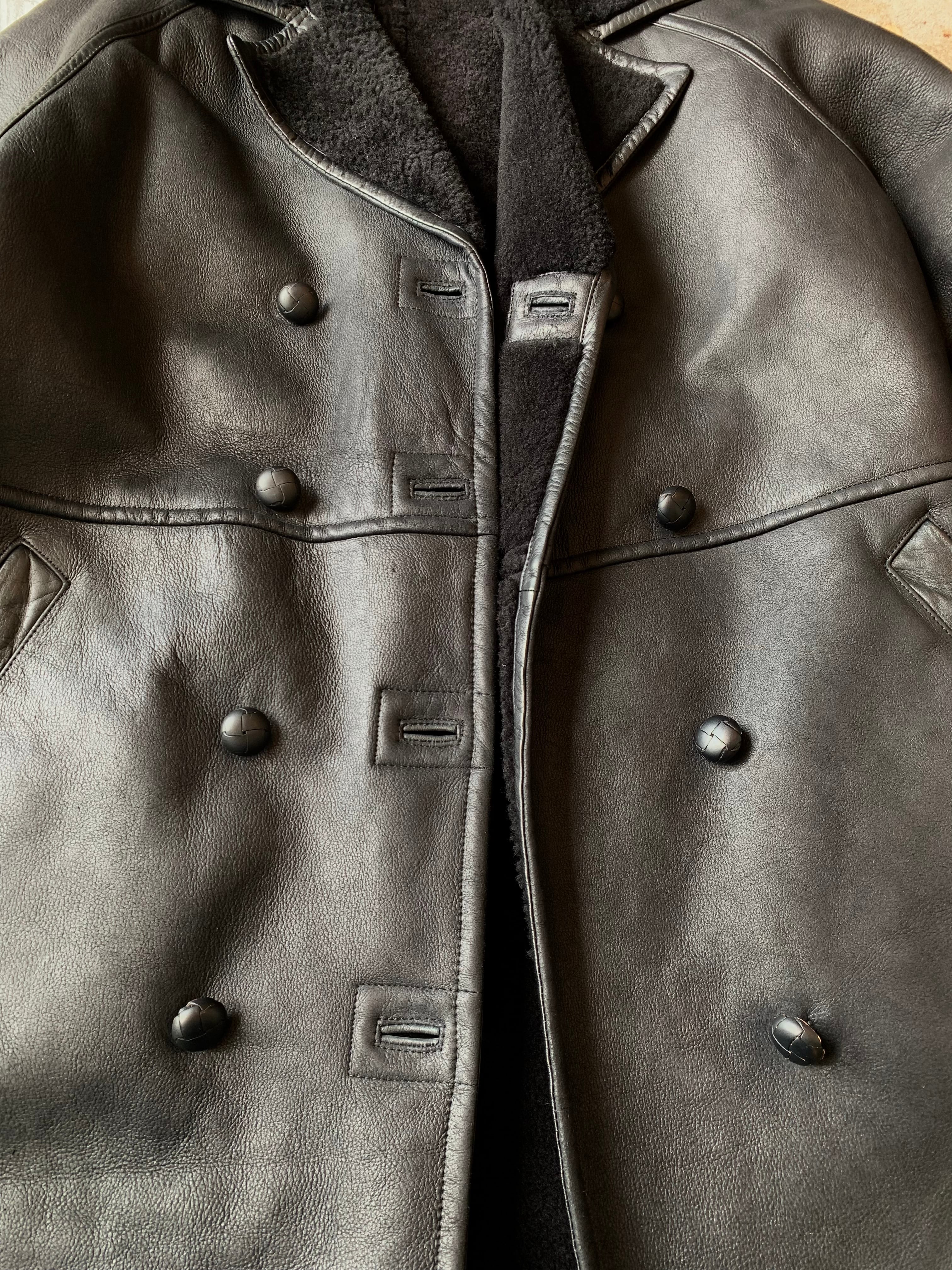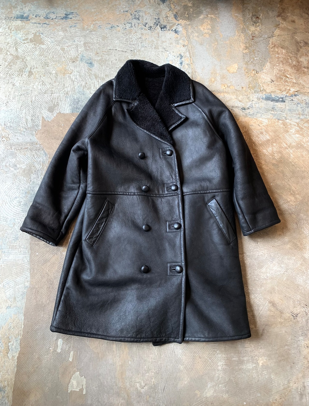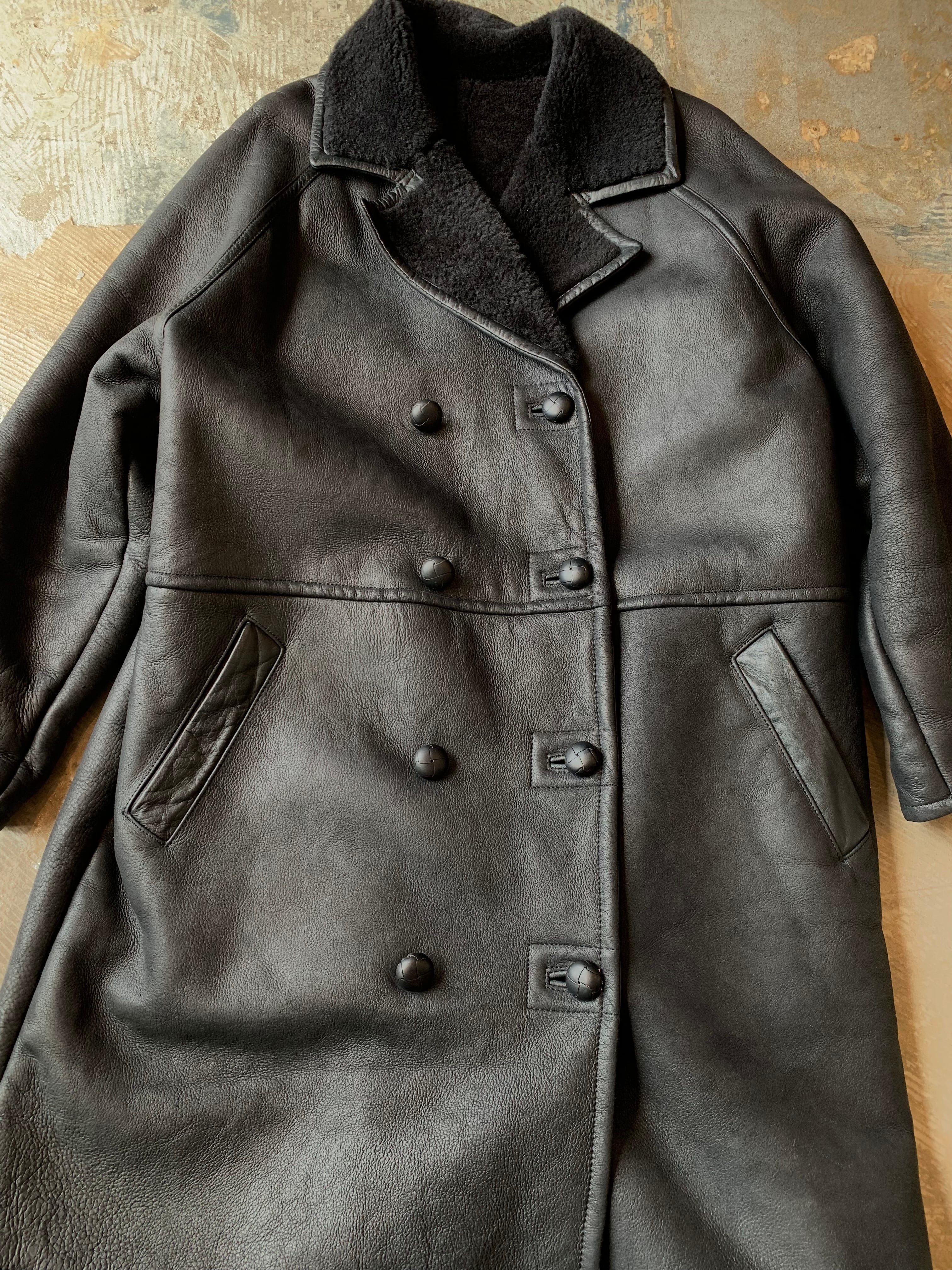 ヴィンテージのブラックカラーのシープスキン、ロングコート。