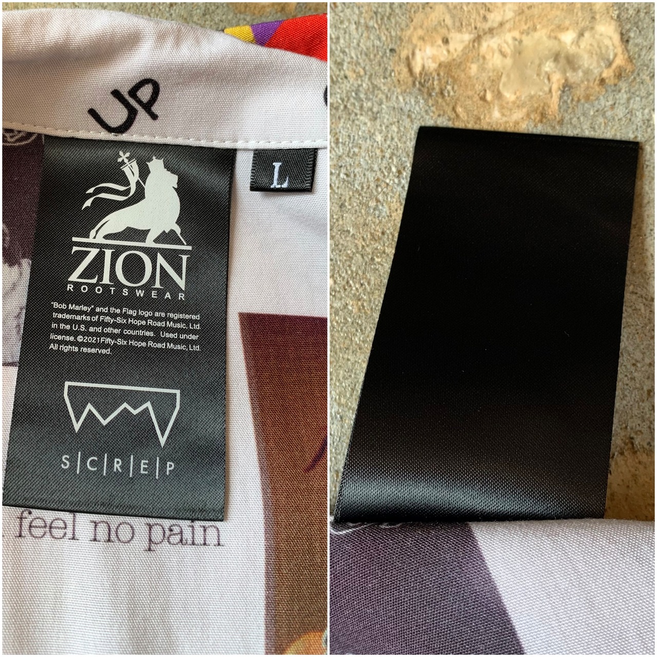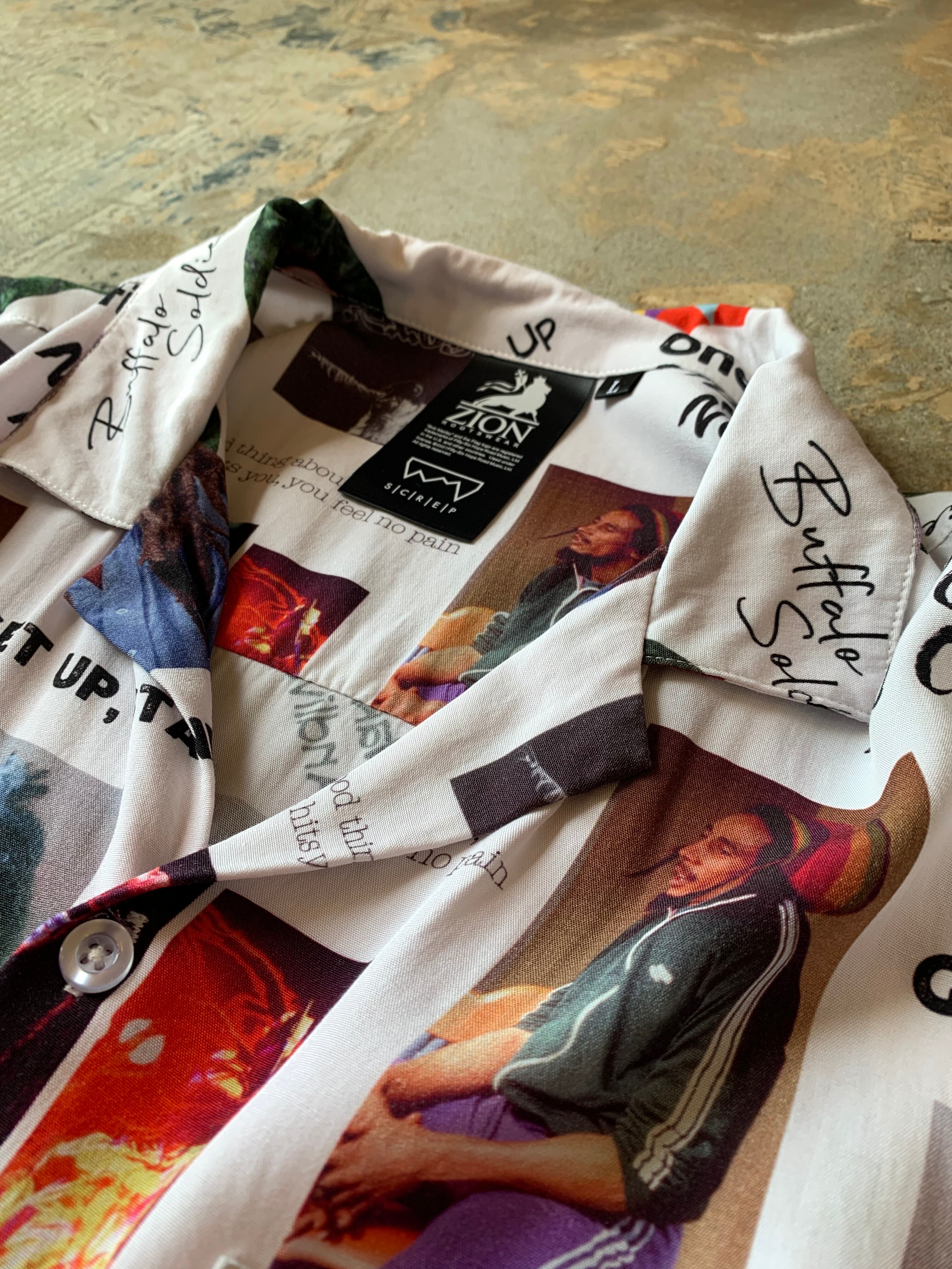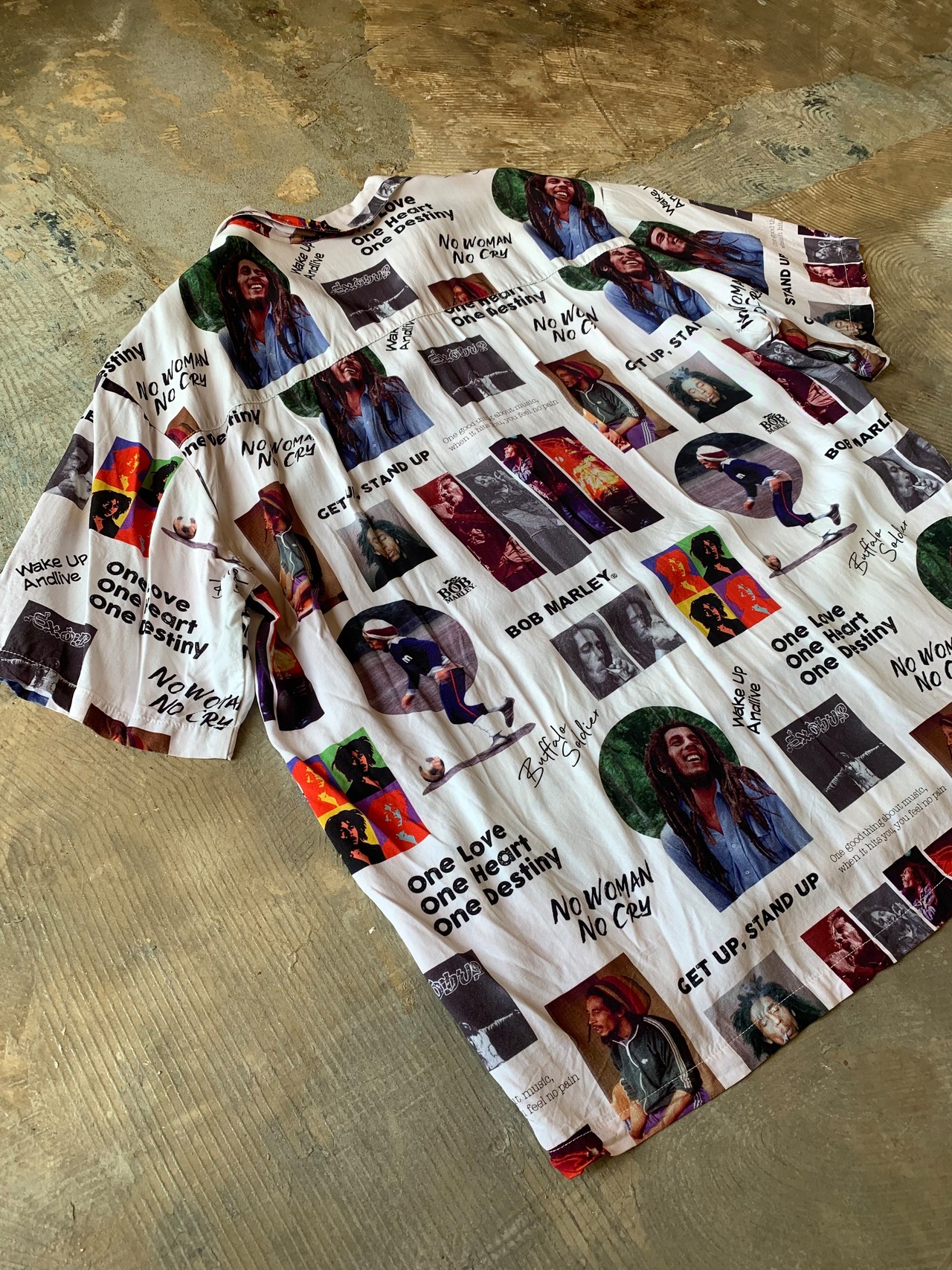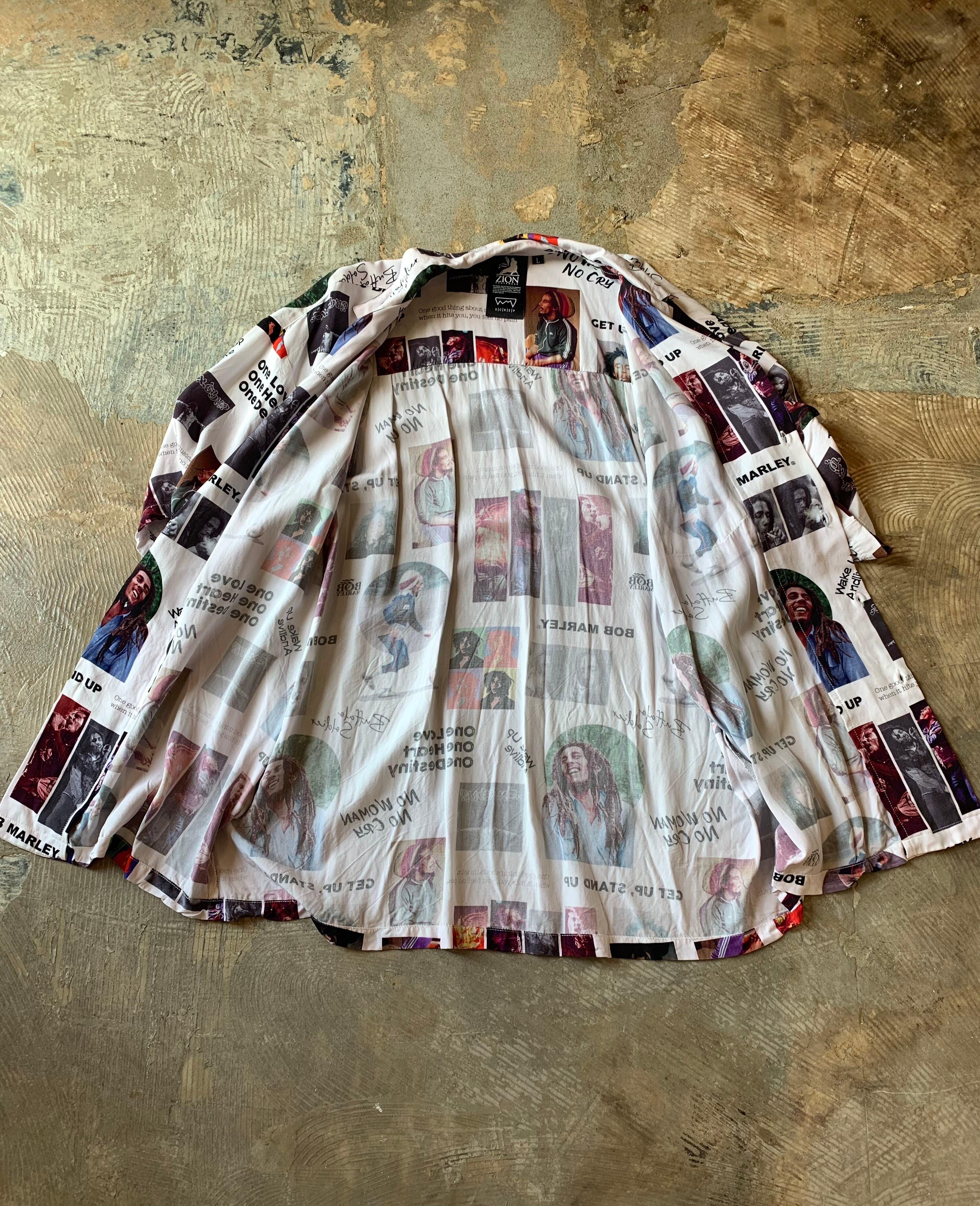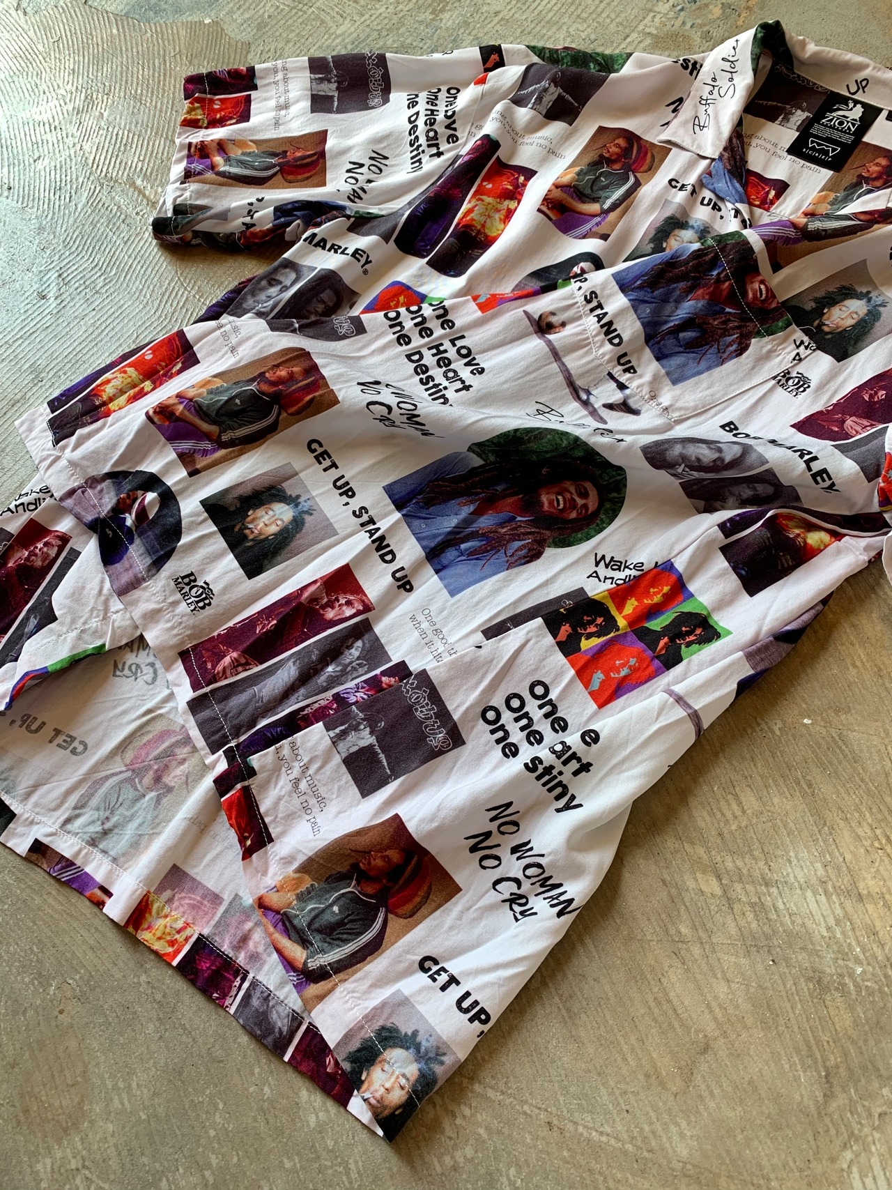 ZION ROOTSWEAR製、ボブ・マーリーの総柄フォトプリントの半袖レーヨンシャツ。