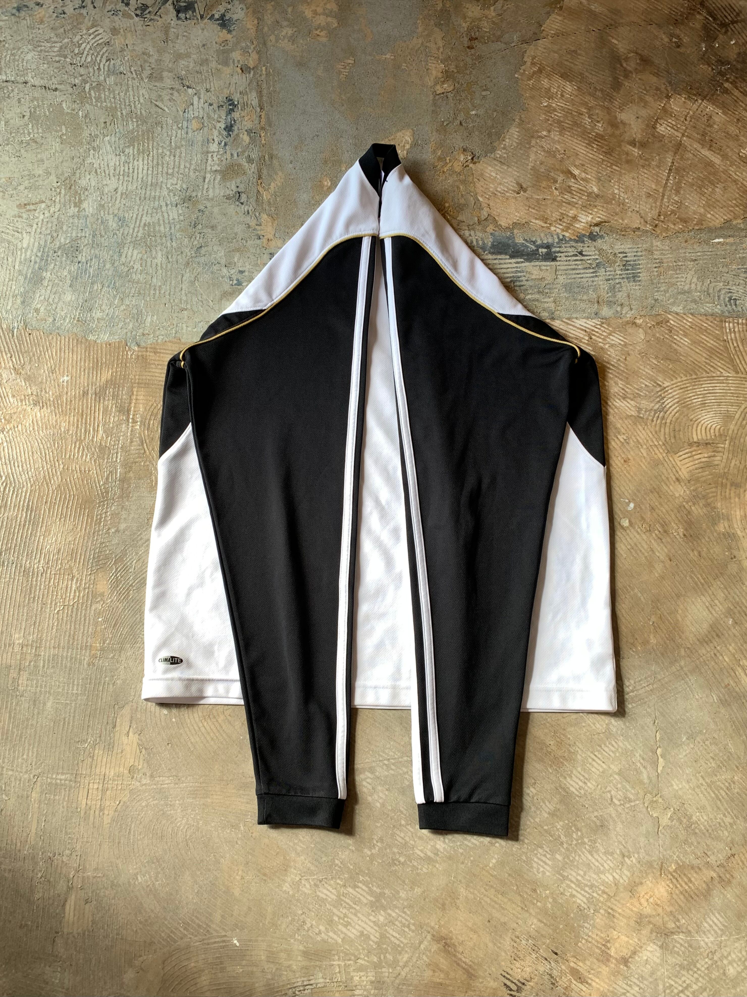 ホワイトXブラックのカラーリングにゴールドのパイピング、左胸にシンプルなロゴプリント、肩から袖先の3本ライン。