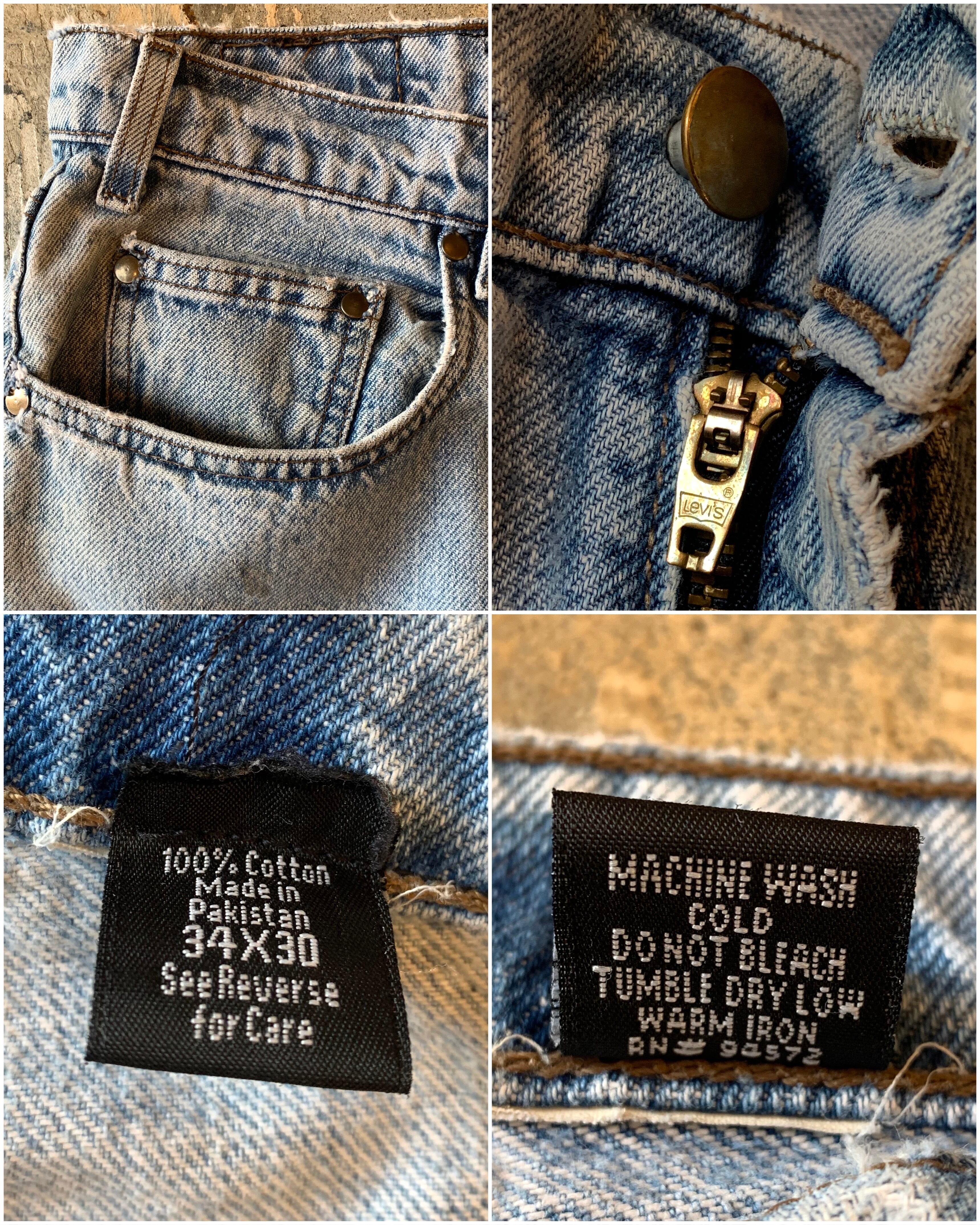 もともとは90年代頃のリーバイスのシルバータブのバギーデニムですがトップボタンやリベット等も全て敢えて取って無地の物に付け替えられてます。腰内側のシルバータブのパッチも剥がされておりその横に黒い製品タグが付けられてます。