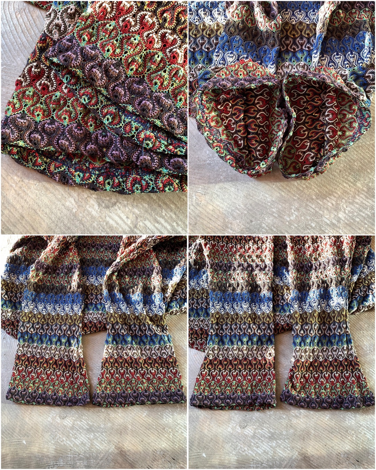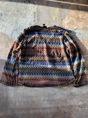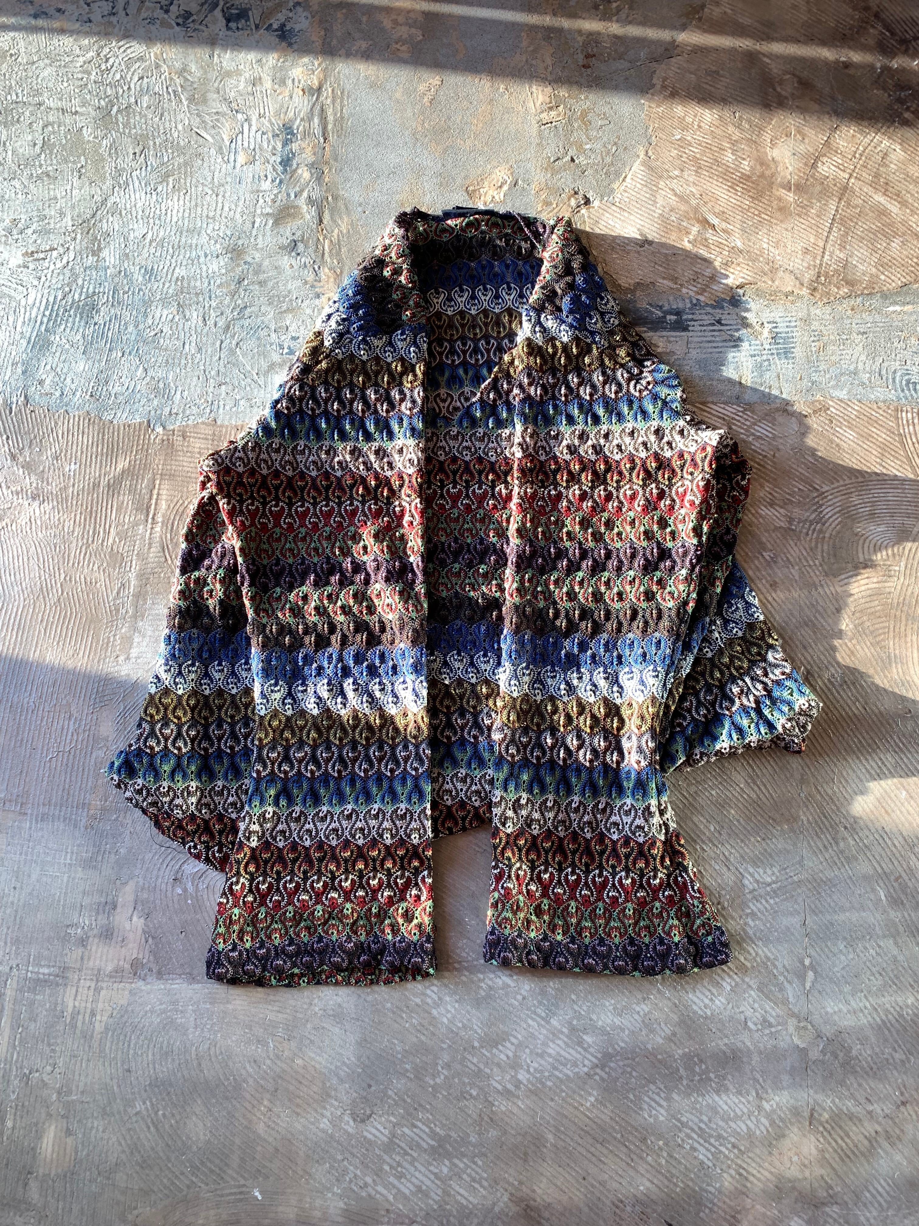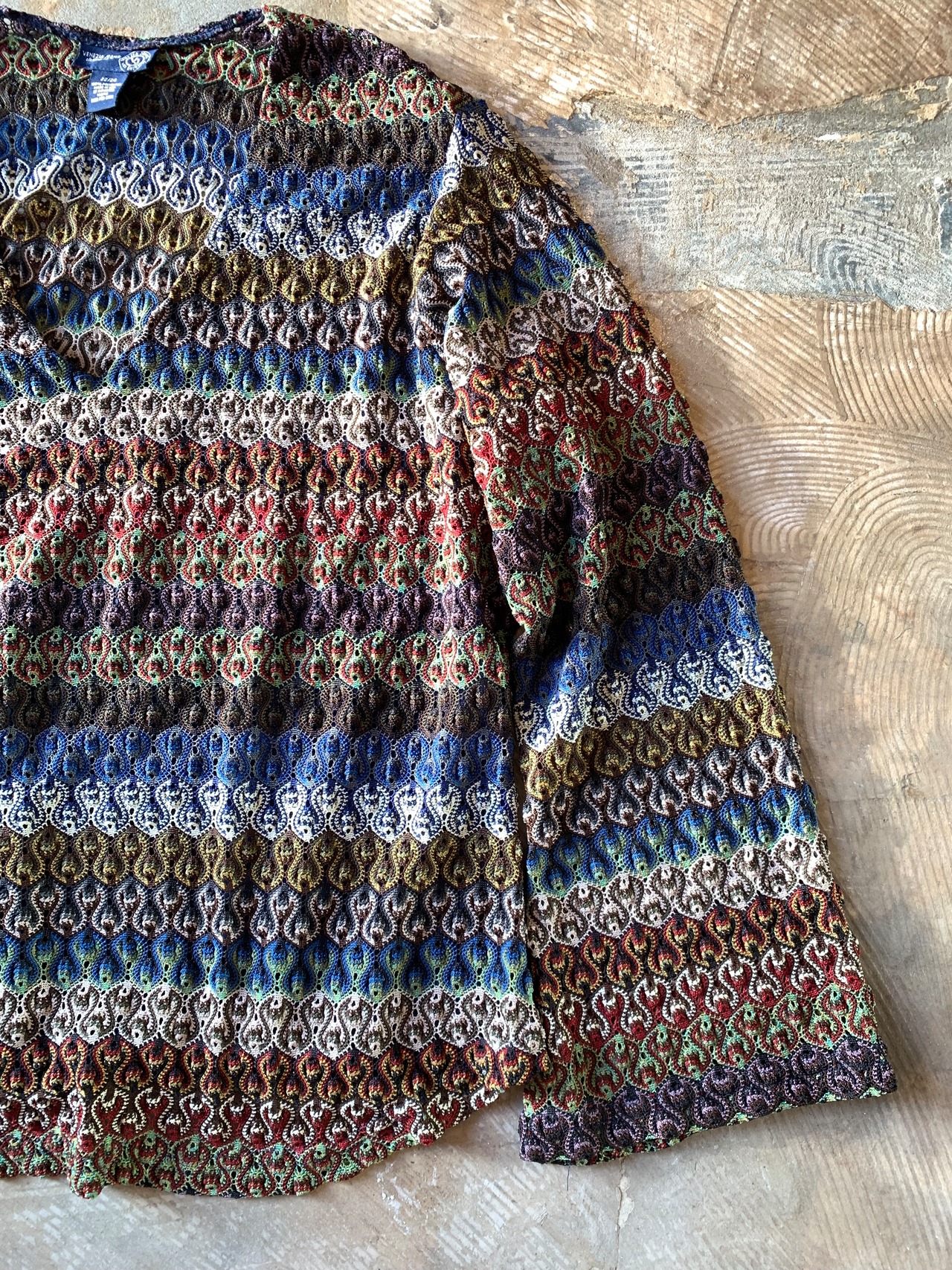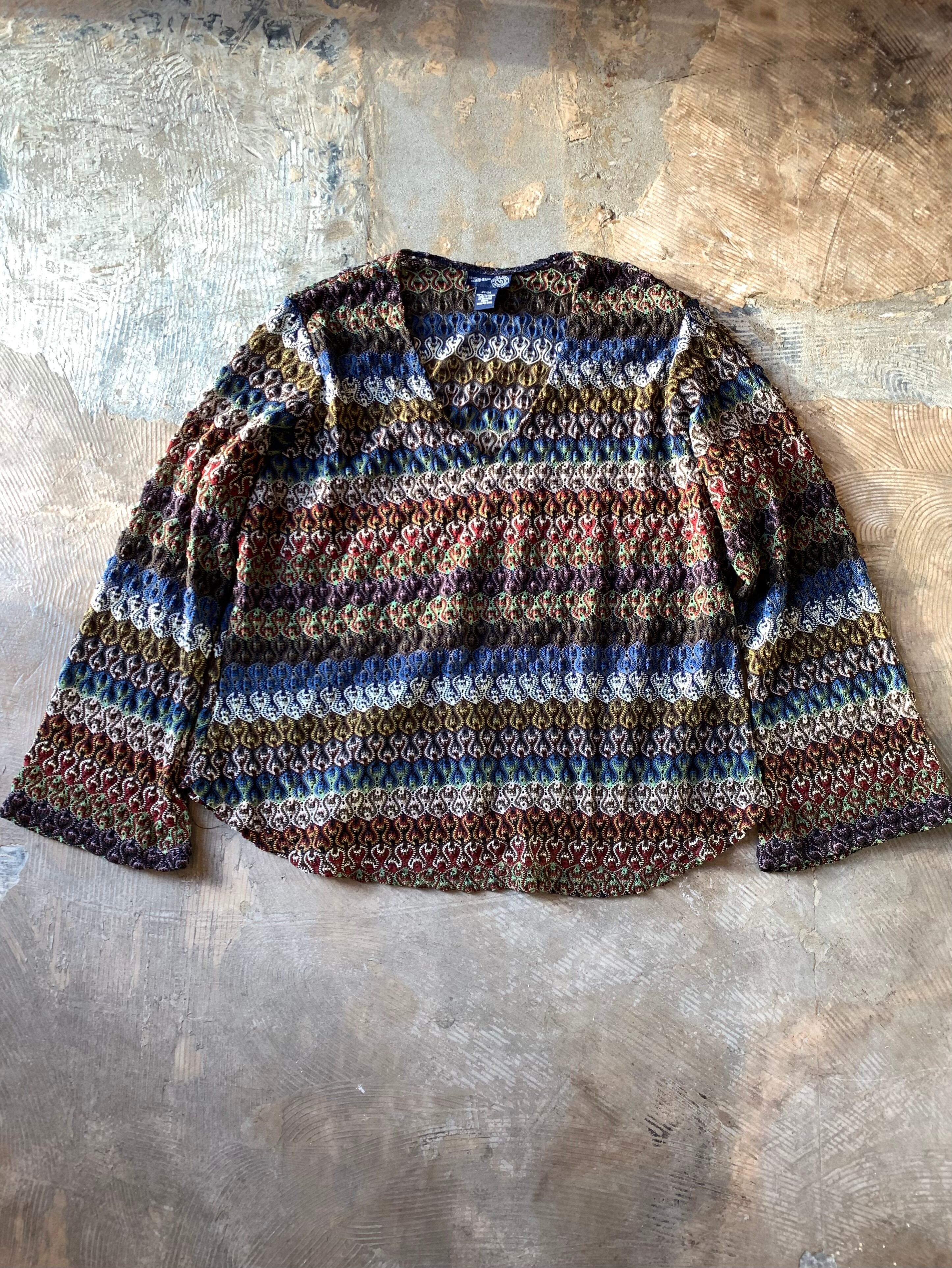 多色使いのカラーリングでボーダーパターン、オトナな深めのVネック、袖も袖先に向かって広がるデザインが滅茶苦茶クールな1着。