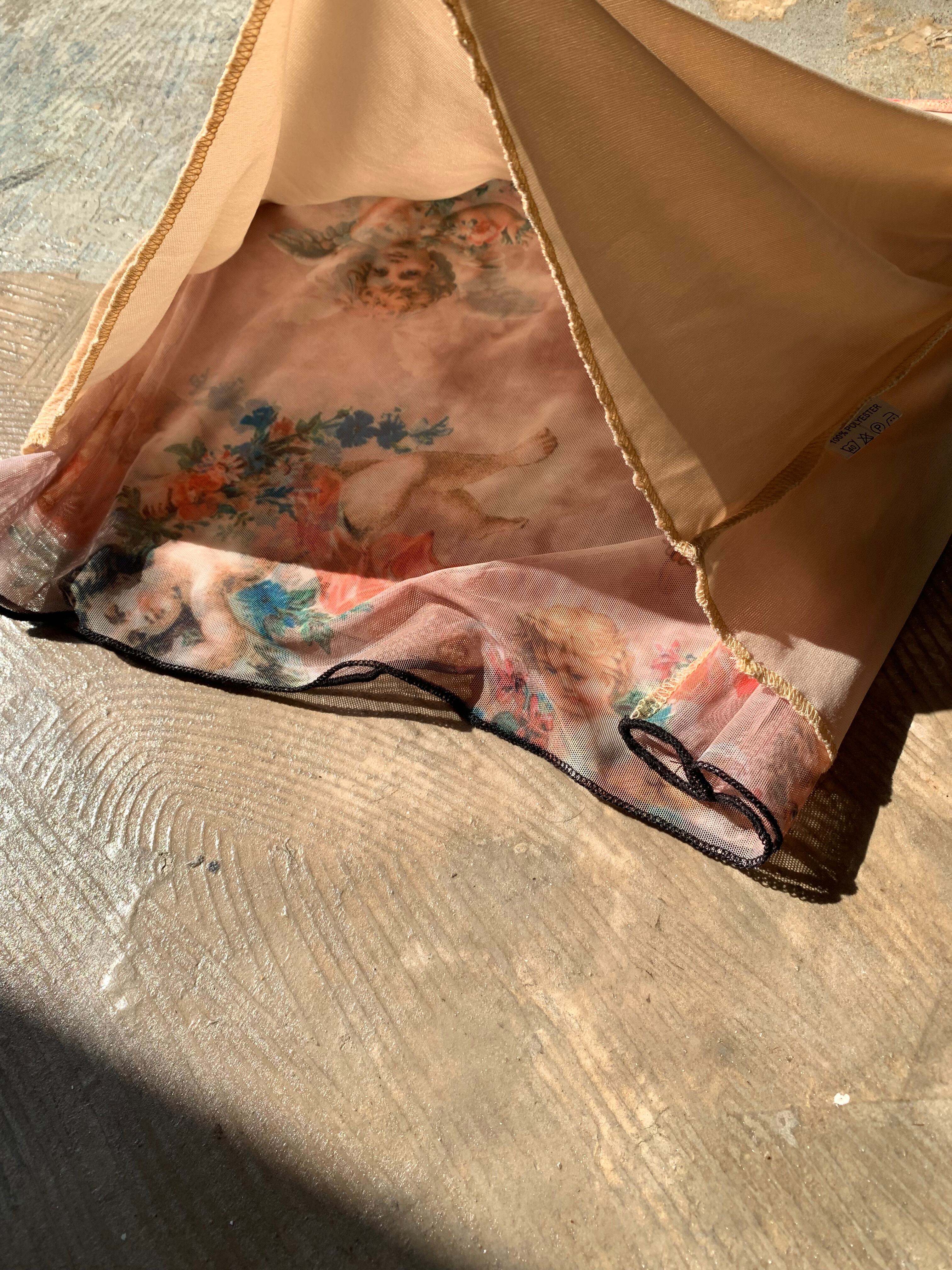 透けるシアー素材、素敵なエンジェルの総柄、カラーリングも独特で個性的。