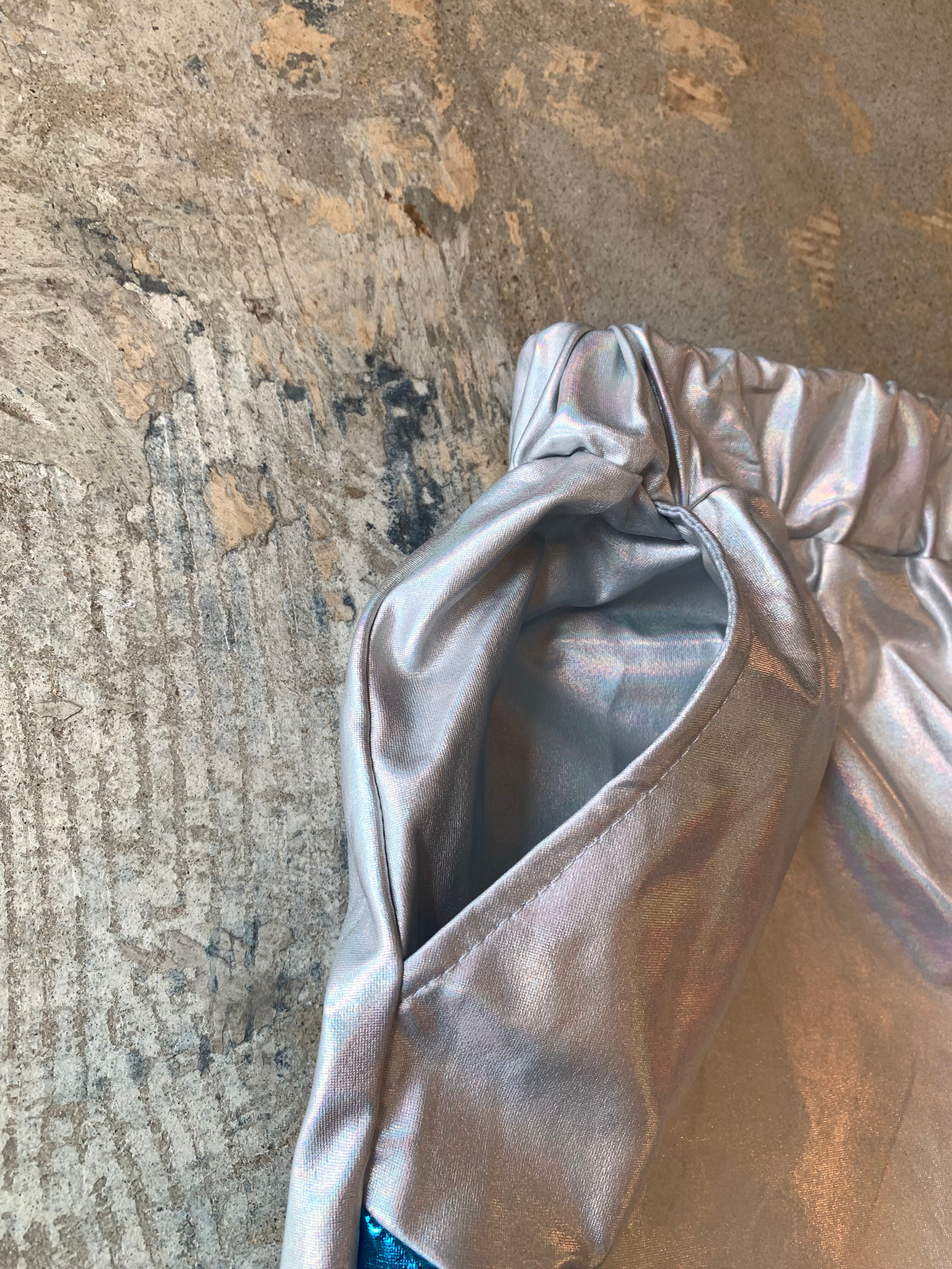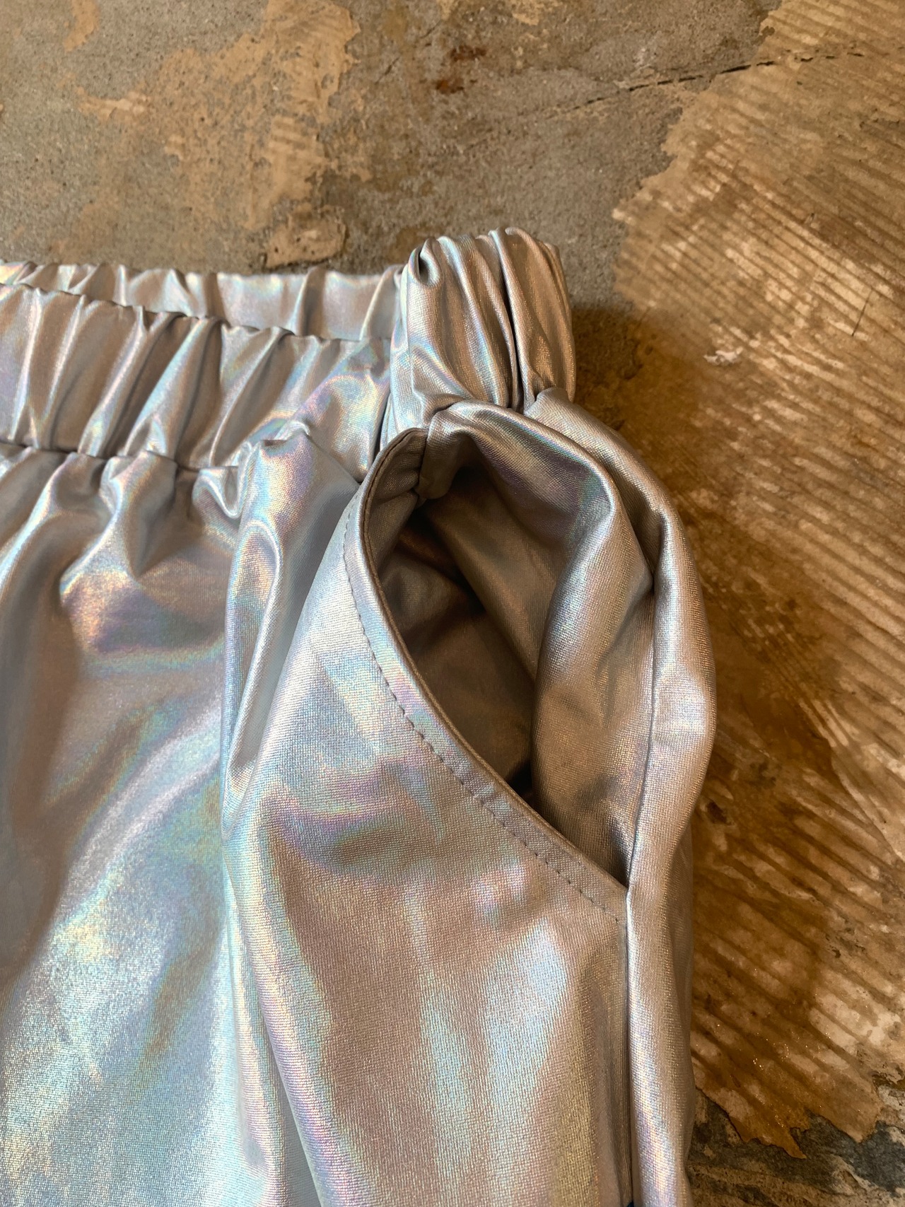 光沢のあるメタリックの生地感で動く度に色々な表情を見せてくれるパンツ。