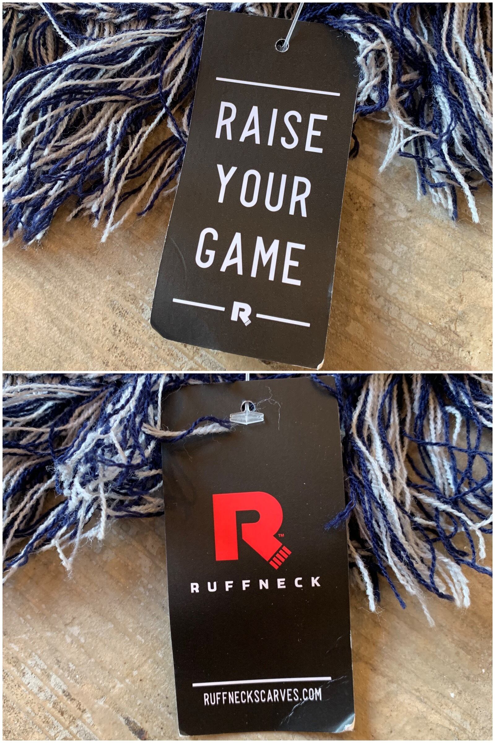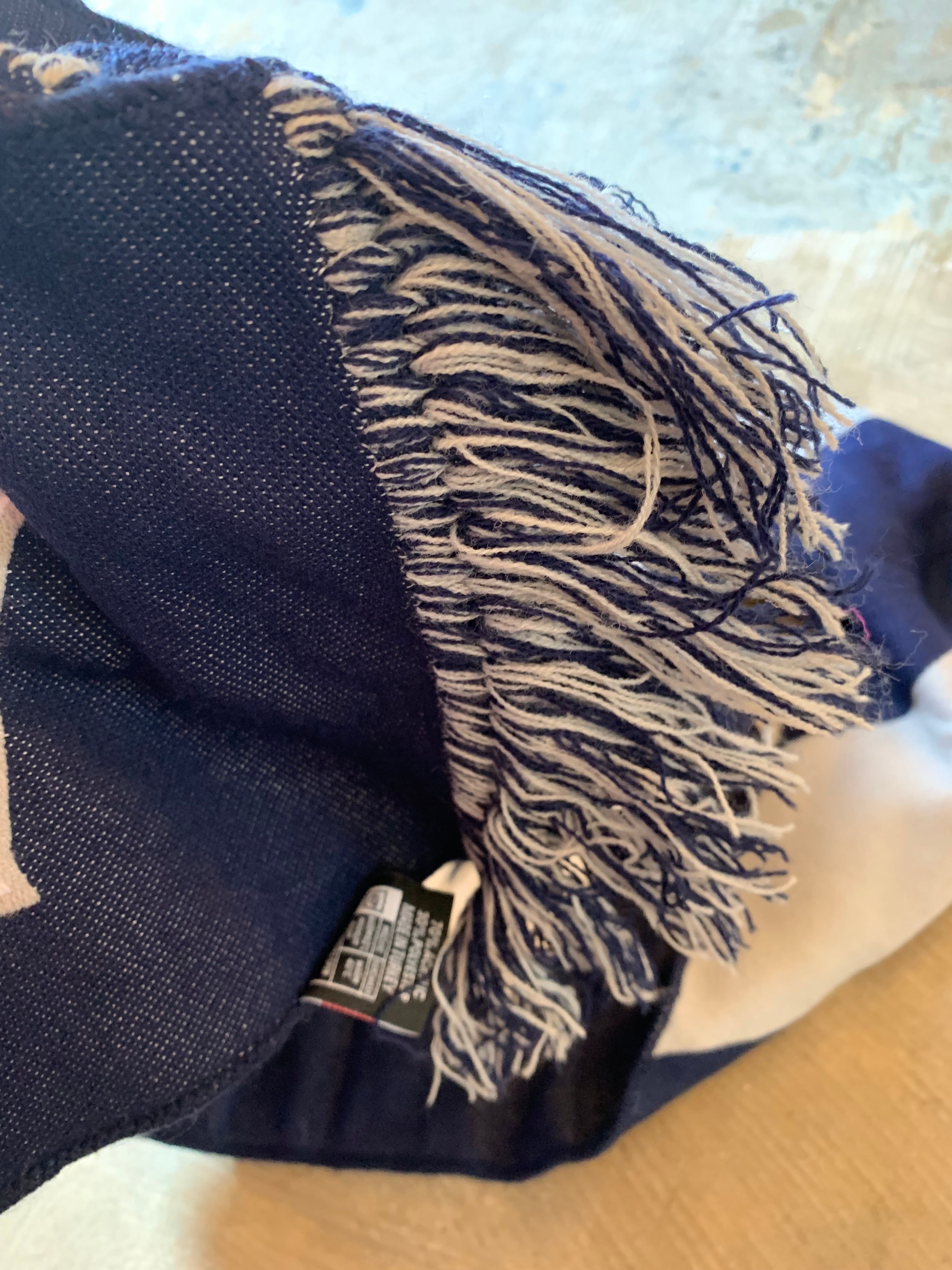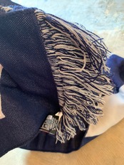 雰囲気あるネイビー Xライトグレーベース、斜めのボーダー柄、両裾先のフリンジ、両面で巻けるデザインが滅茶苦茶クール‼︎