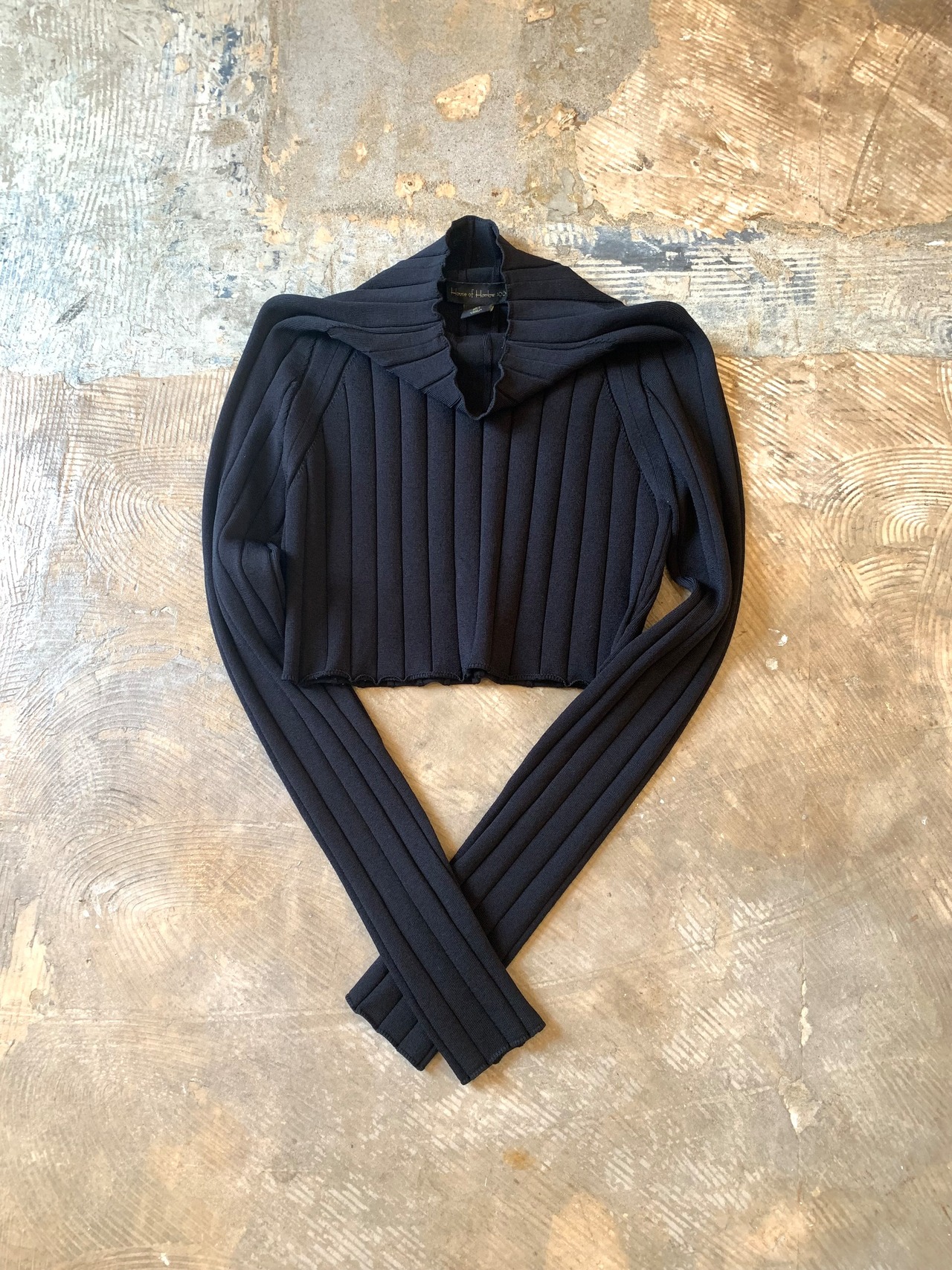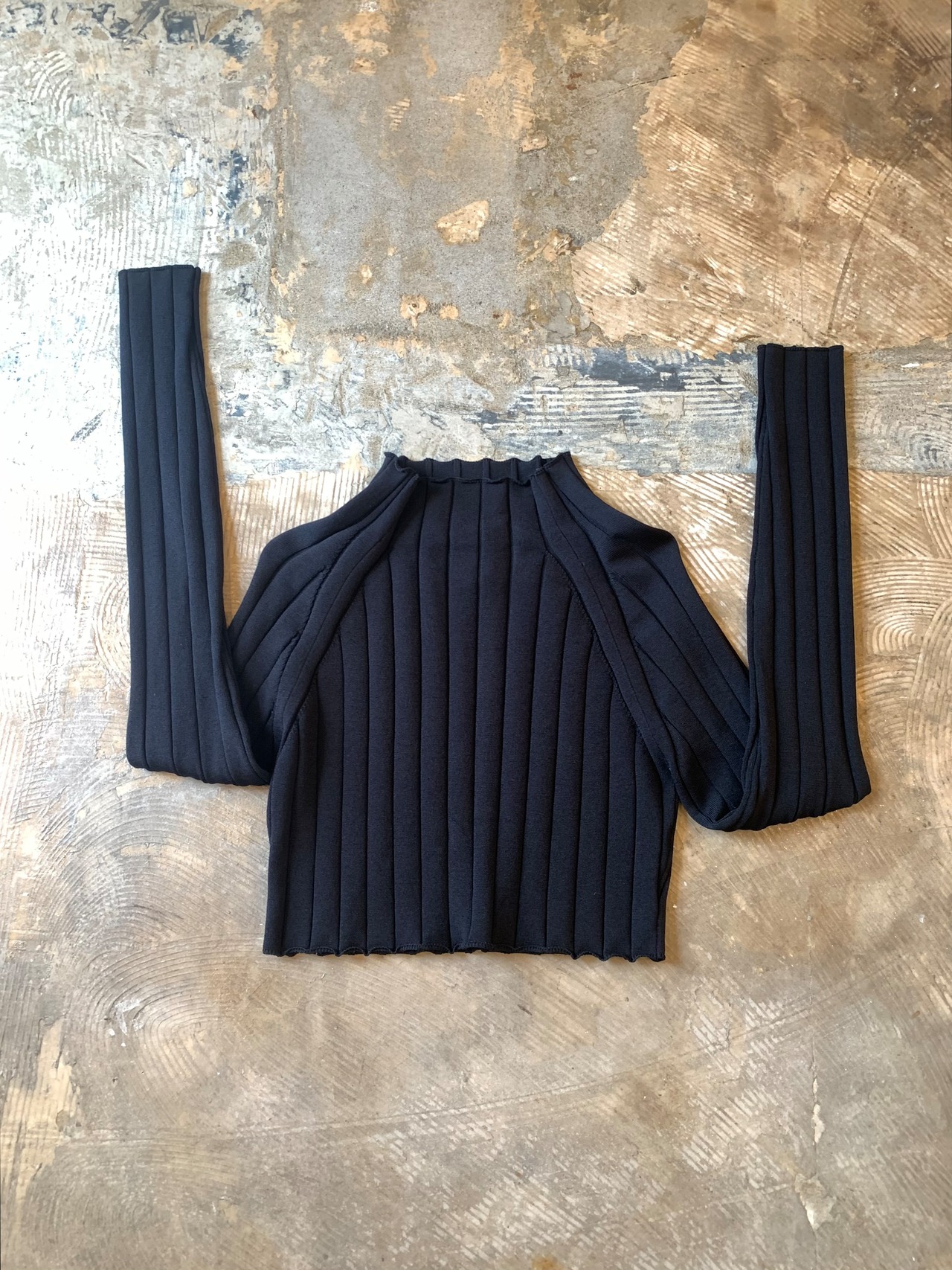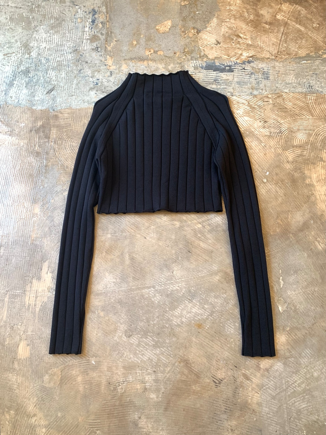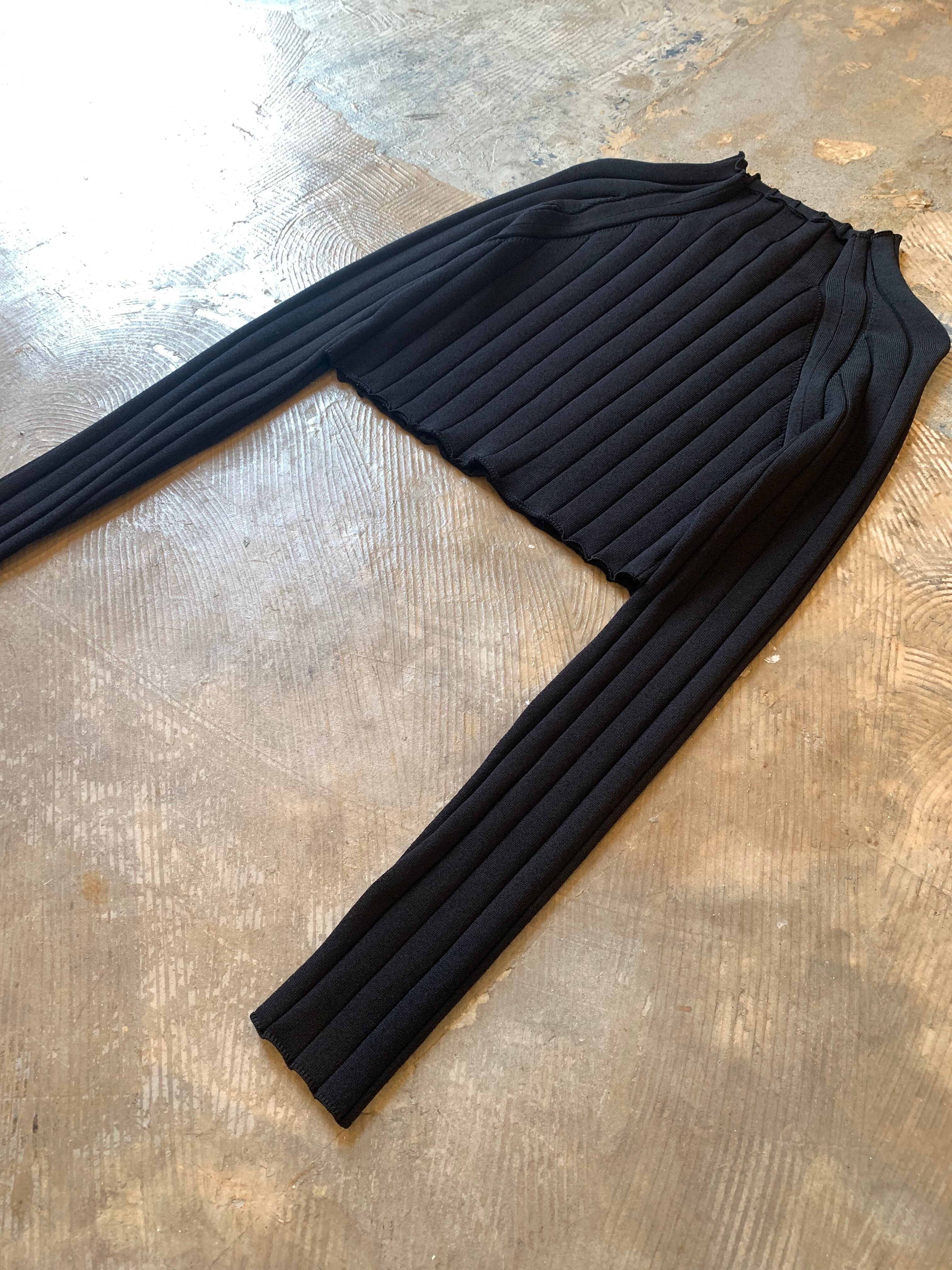 ブラックカラーの単色、オトナなリブデザイン、肌触りの良い素材、オヘソが出せるショートレングスの短丈が魅力的な1着。