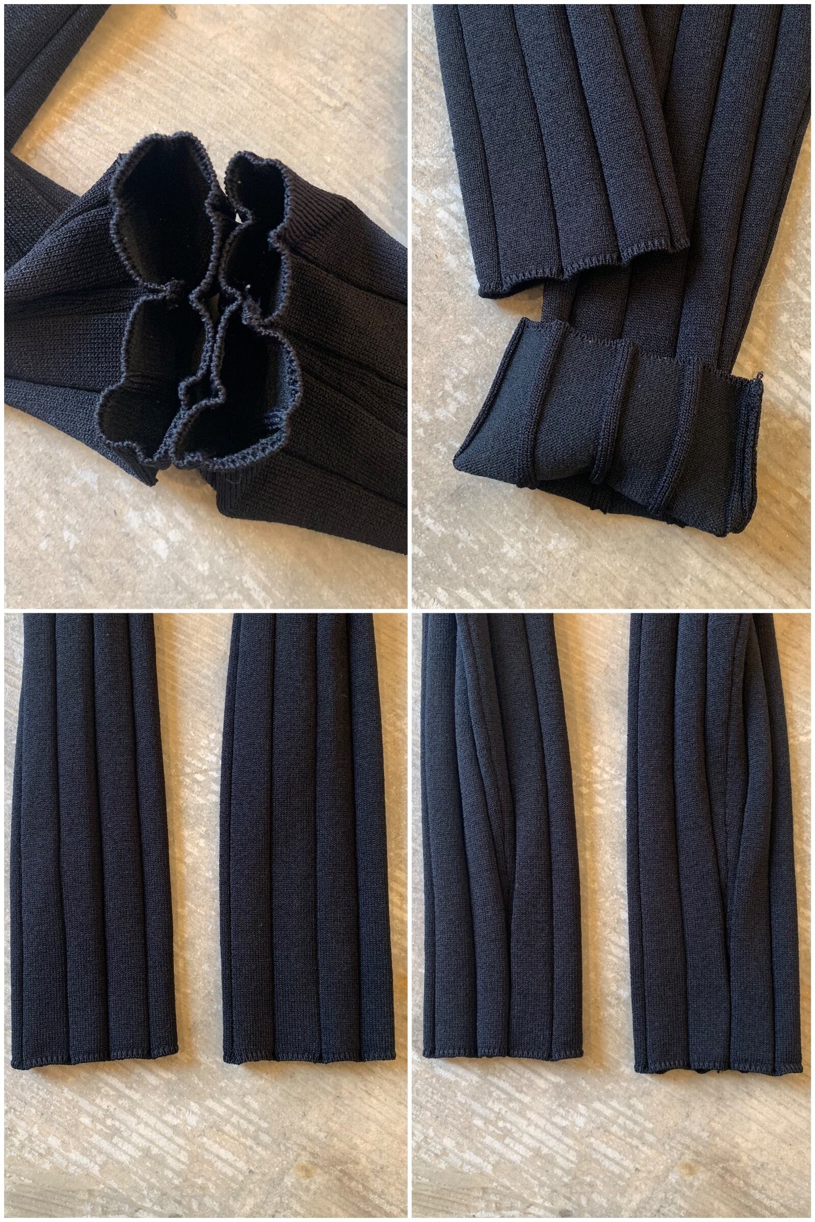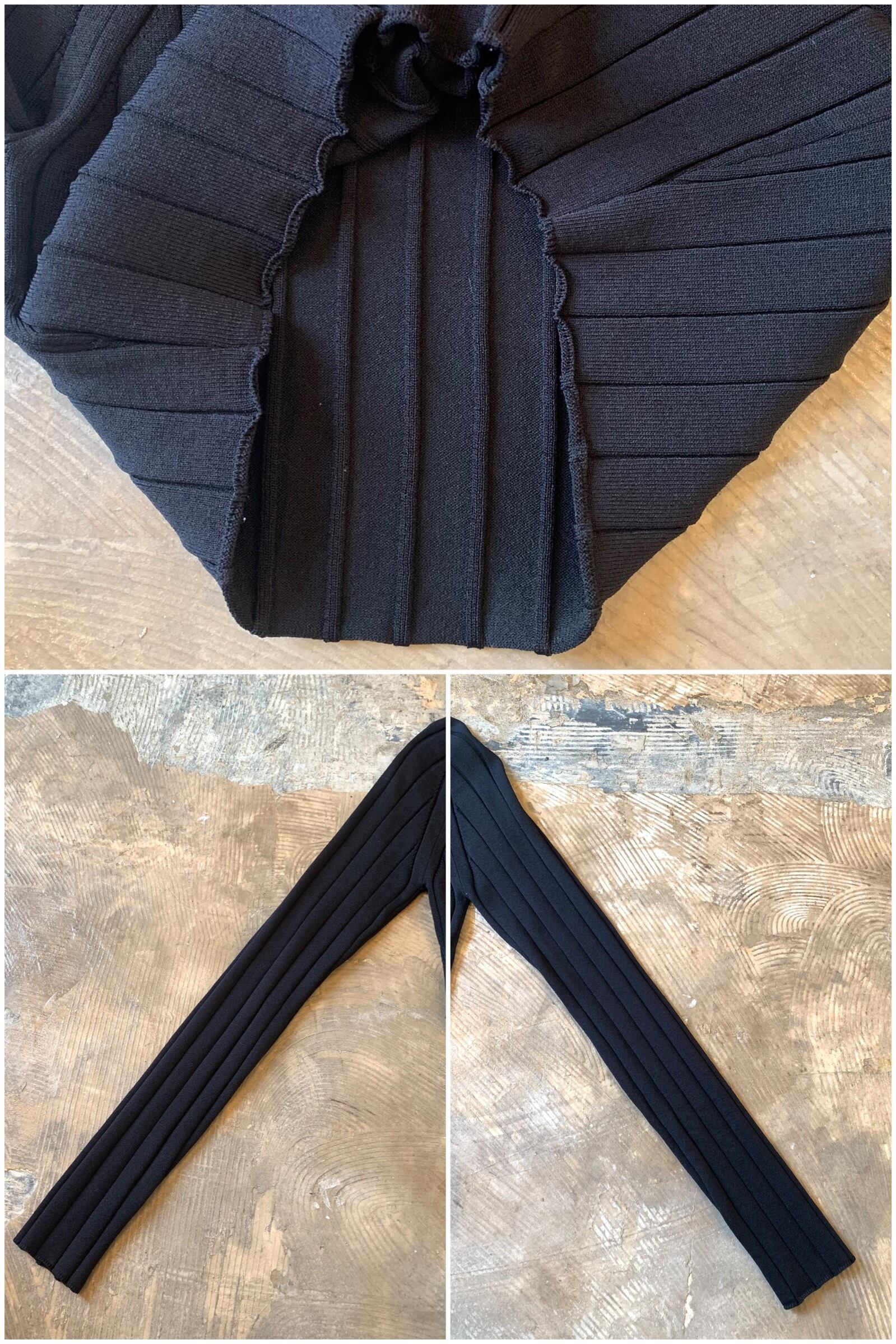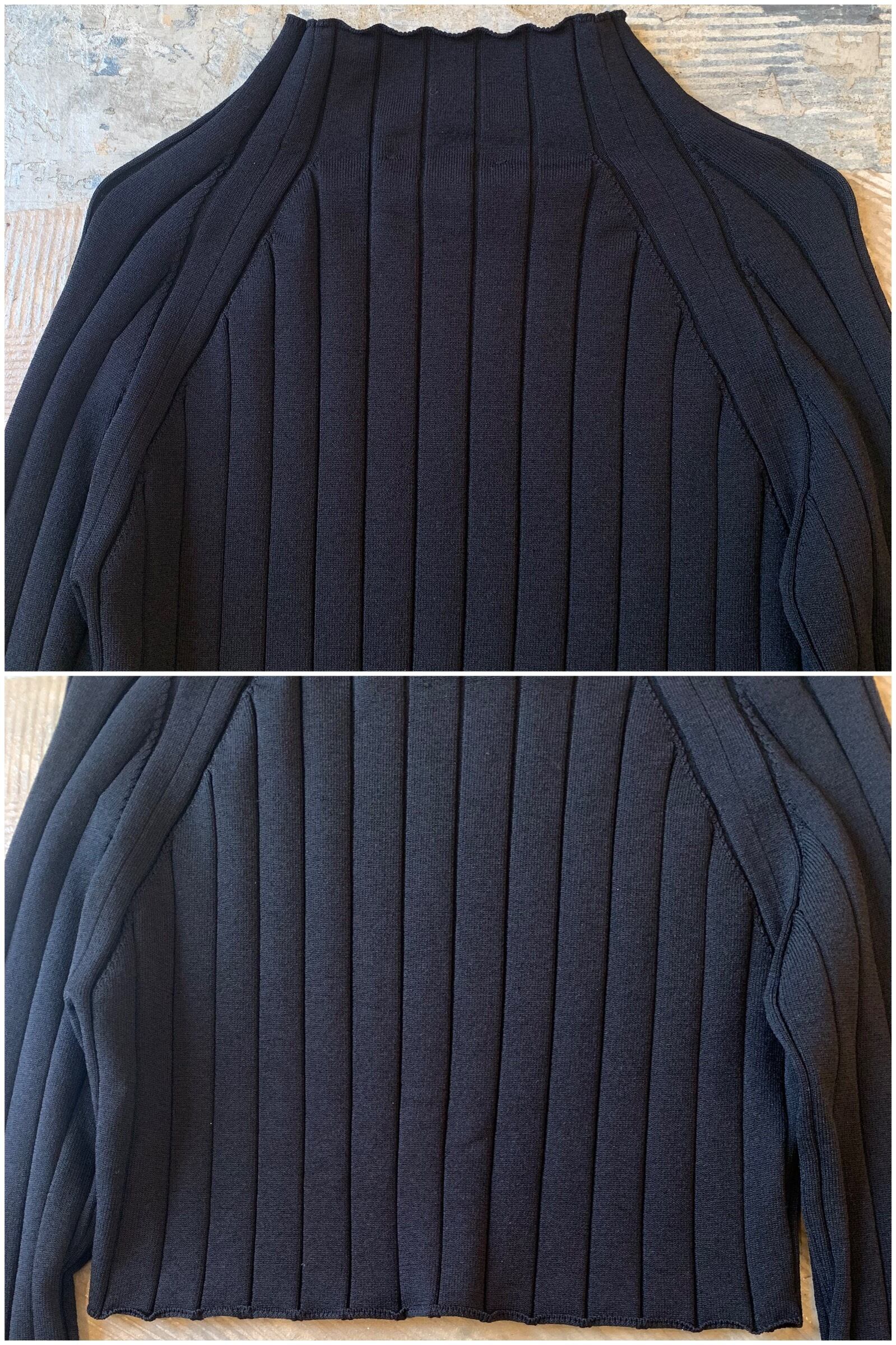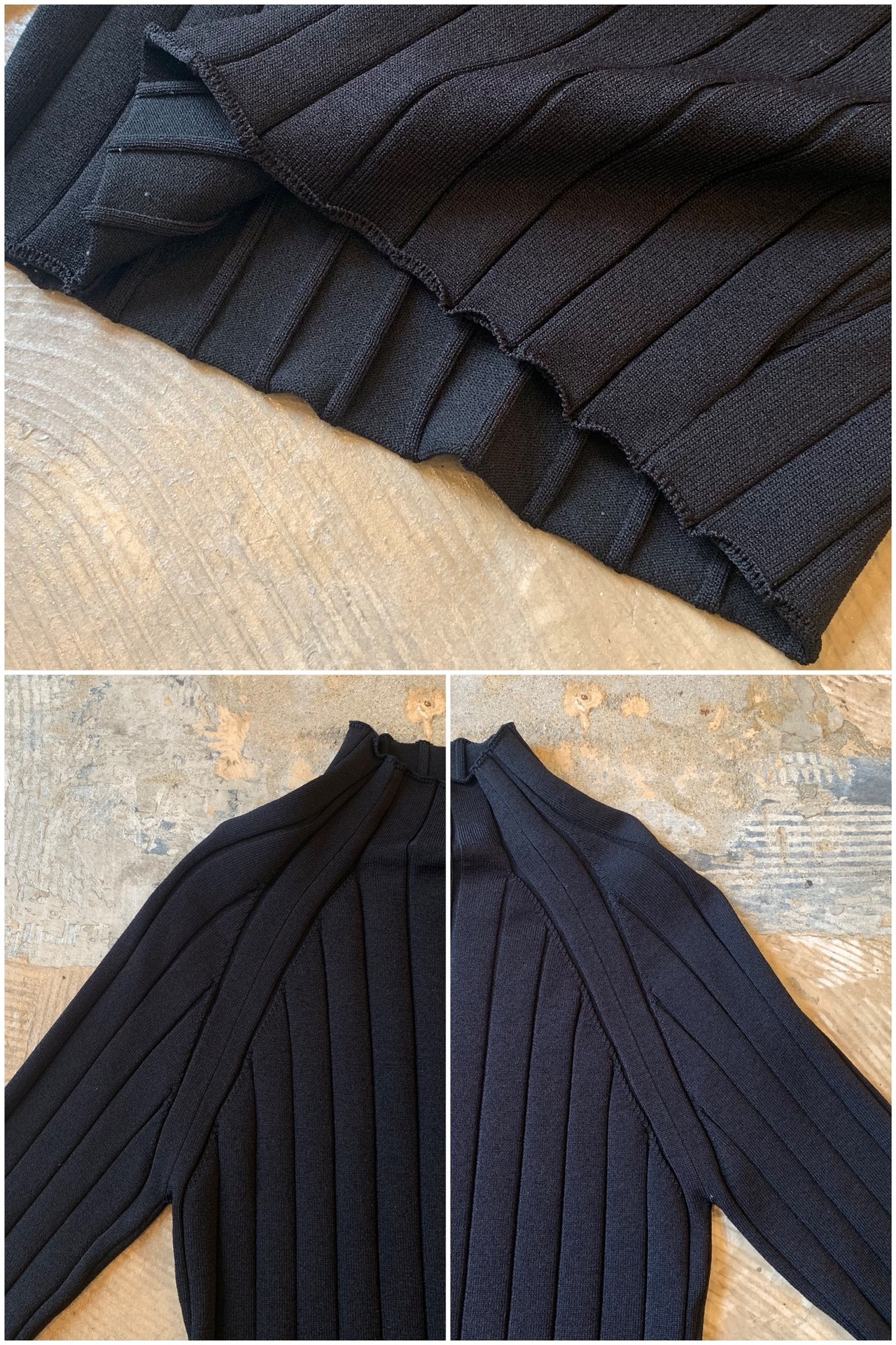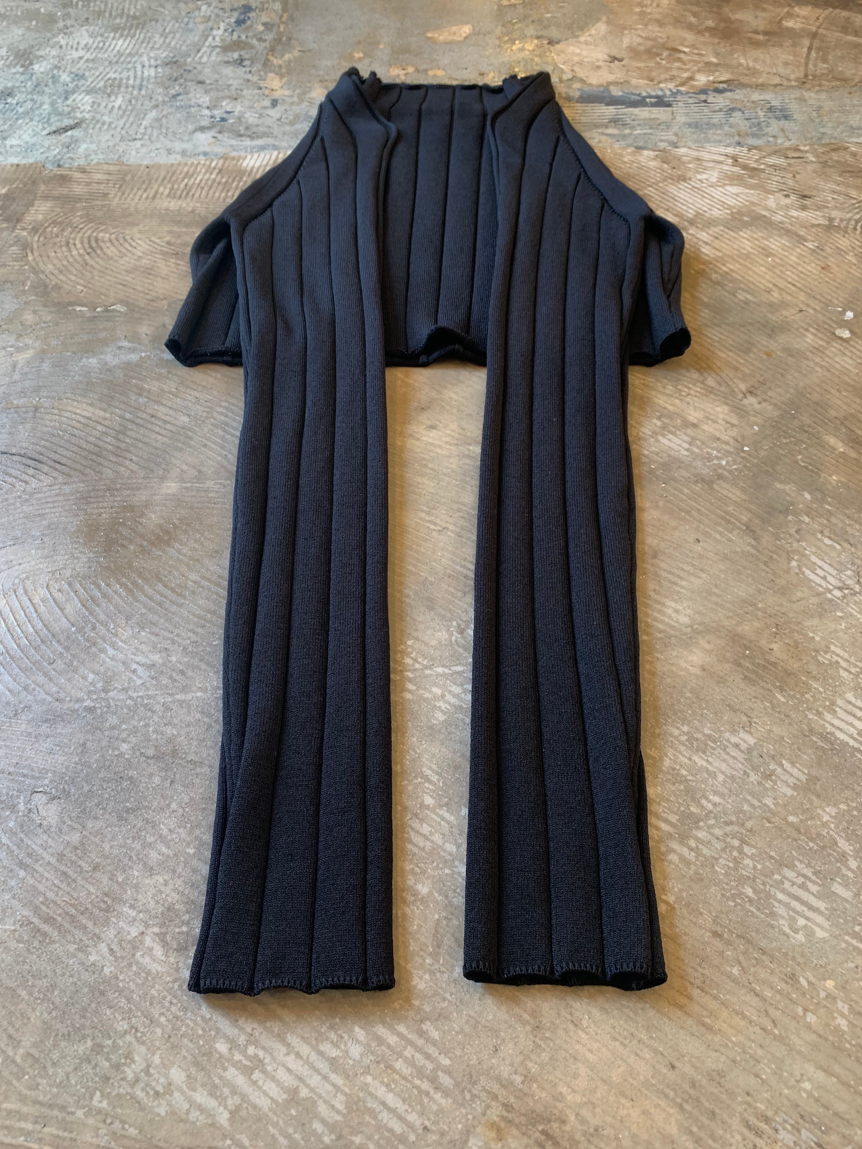 ブラックカラーの単色、オトナなリブデザイン、肌触りの良い素材、オヘソが出せるショートレングスの短丈が魅力的な1着。