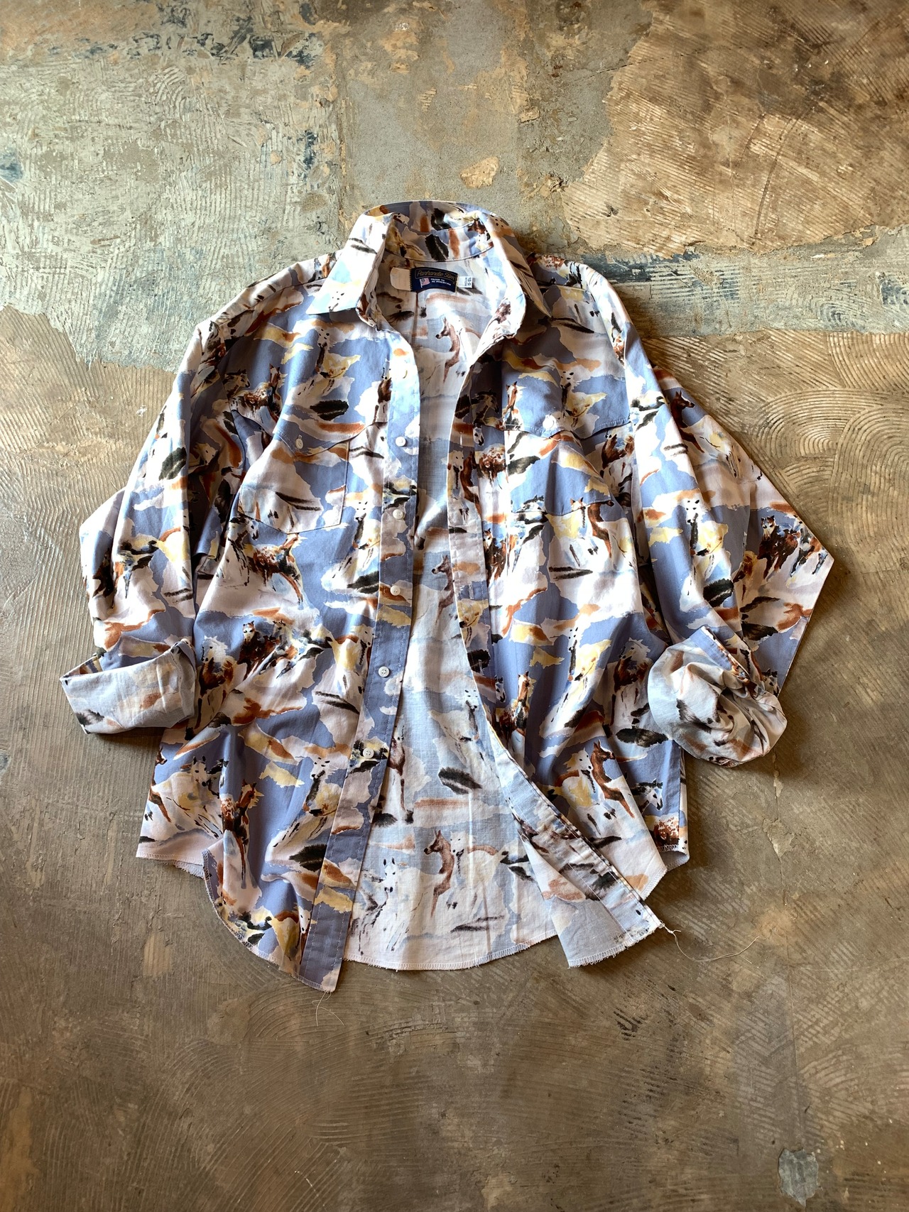 なかなかの個性的なアイテムで馬の総柄でさえ目を惹くのですが今回の様にウエスタンヨークがポケットフラップになった珍しい1着‼︎